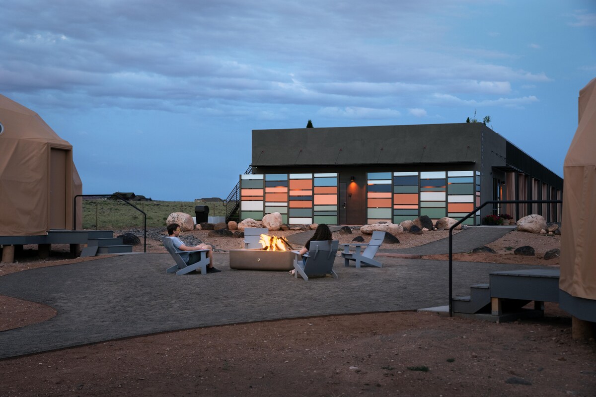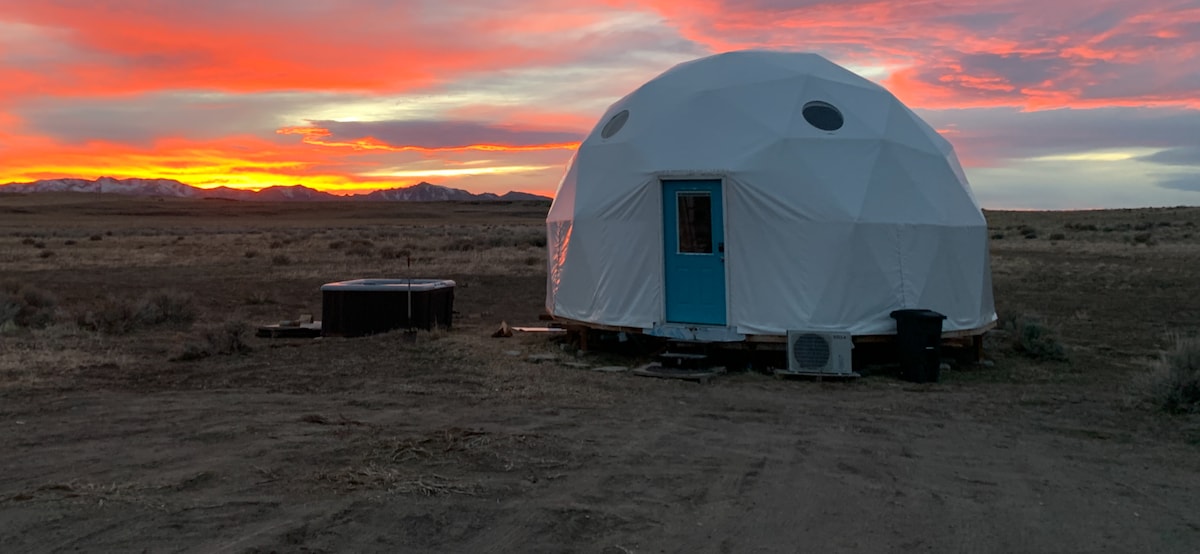 Our Glamping King Skylight Dome at Skyview Hotel offers an elevated camping experience with all the modern comforts. Unwind and embrace the feel of sleeping under the stars with a skylight situated directly above the King bed. Relax with our modern lounge seating and enjoy the views from the centrally located fire pit (S'mores are on us). Enjoy luxury bed and bath linens, locally sourced complimentary treats and your own private centrally located bathroom located approximately 150 feet away.