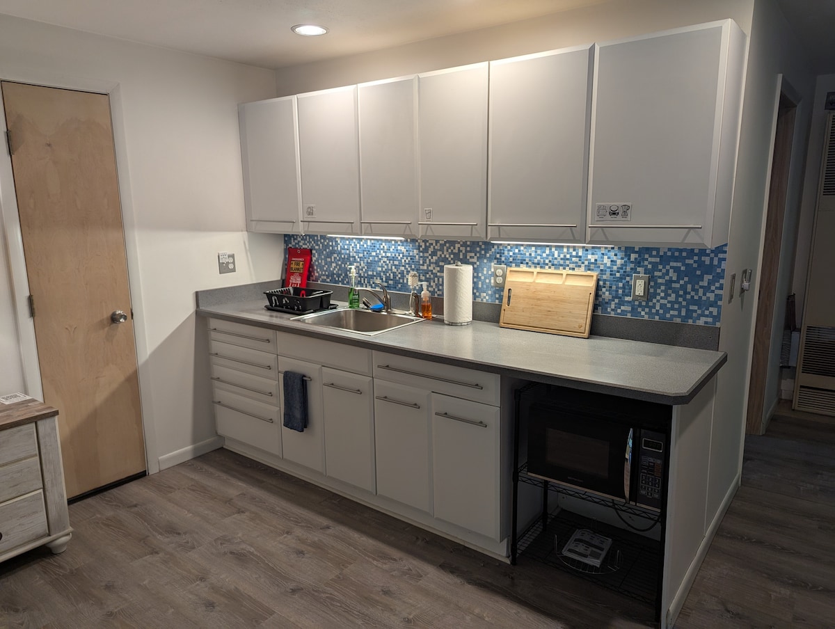 大型獨立二樓單間公寓式起居區,配有雙人床、沙發、桌子/椅子、電視、冰箱、微波爐、電熱爐、無烤箱或爐台、水槽、大淋浴間、空調、暖氣、洗衣機和烘乾機以及露台。 提供WiFi網路。 電視有Netflix。沒有有線頻道。 熔爐是非傳統的。它不在衣櫃裡。冬季月份,運行和啟動時的噪音會比平時大。可為噪音敏感的房客提供耳塞。