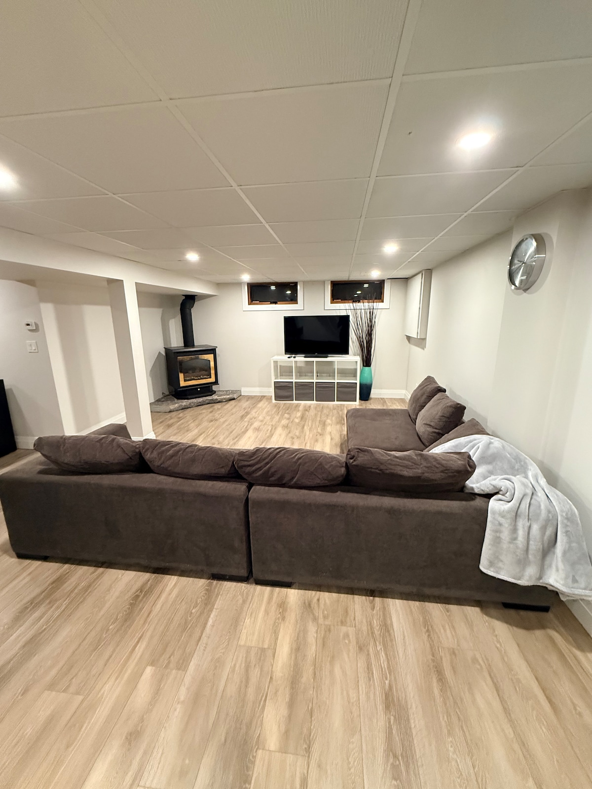 Relax in this bright, spacious basement retreat located in a quiet New Hamburg neighborhood. The open-concept living area features comfortable seating, warm wood-style floors, and a cozy fireplace that adds a charming, cabin-like touch. Clean, well-maintained, and peaceful, the space is ideal for couples, solo travelers, or small families. Conveniently located near local shops and a short drive to Kitchener–Waterloo, it’s a comfortable base for work or leisure.