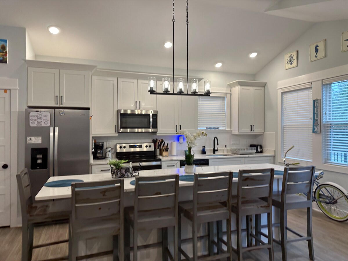 5 minutes to the beach! Our pet- and family-friendly remodeled 3BR/2BA is minutes from the beach with private oceanfront parking. End your day with a short walk to the Sound for amazing sunsets. Guests love the open floor plan, gourmet kitchen, and luxurious walk-in shower. We recommend starting the day with coffee on the covered porch. Other features include fenced pet area, grill/patio, bikes and beach gear galore. Guests have free access to the YMCA, featuring a seasonal outdoor pool.