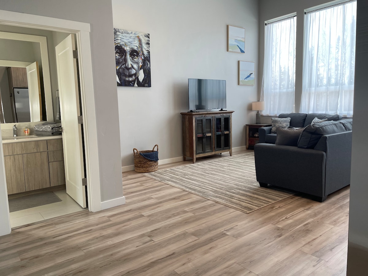 我們在一個安靜的街區,在一個美麗的2.5英畝的房源中,出租一個寬敞的1間臥室公寓。 您可以使用整套公寓,並有獨立入口。此房源交通便利,距離安克雷奇以北30分鐘,距離馬特蘇谷以南30分鐘,足夠遠離市區,但仍靠近許多便利設施和極佳的戶外機會,包括徒步旅行、划獨木舟和觀光。