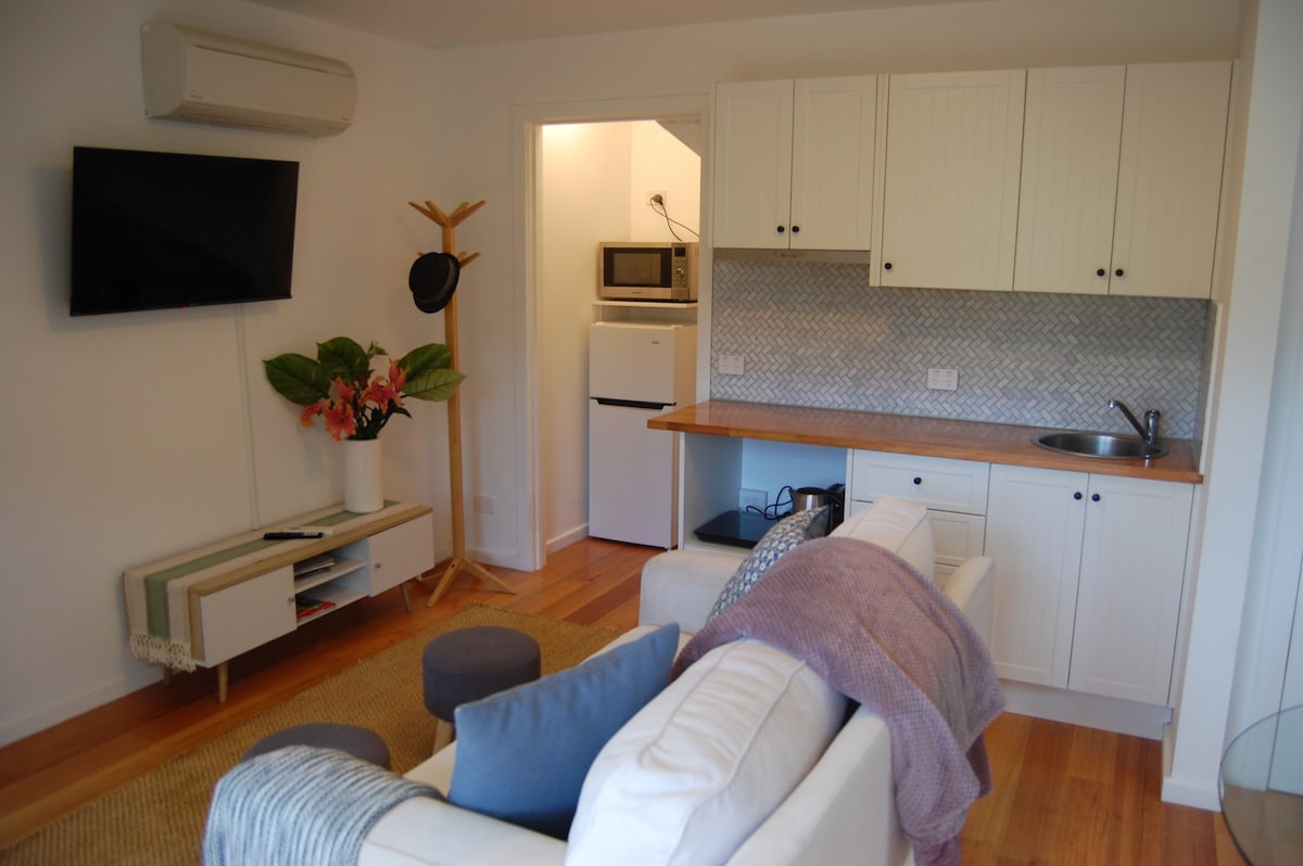Jan's Studio has a cosy queen sized bed, and a small lounge-kitchen space equipped with everything you need to make your stay comfortable. There is WiFi and off-street parking. The space is a separate dwelling looking onto a beautiful garden. It is set in a peaceful neighbourhood and is a short walk to local parks, cafes, and restaurants. Jan's studio lies at the foot of kunanyi/Mount Wellington, and is less than 3 km to Hobart and Salamanca, with its popular Saturday market.