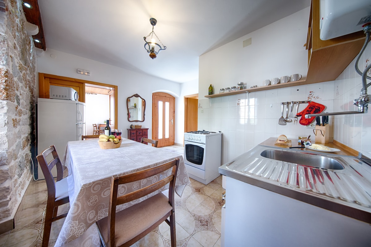 Our charming and cozy one bedroom apartment is located in the ground floor of the one hundred years old house in the quiet street some 30 metres from the sea. Court yard with wooden chairs and table covered with wild grape tree is the real chill zone.