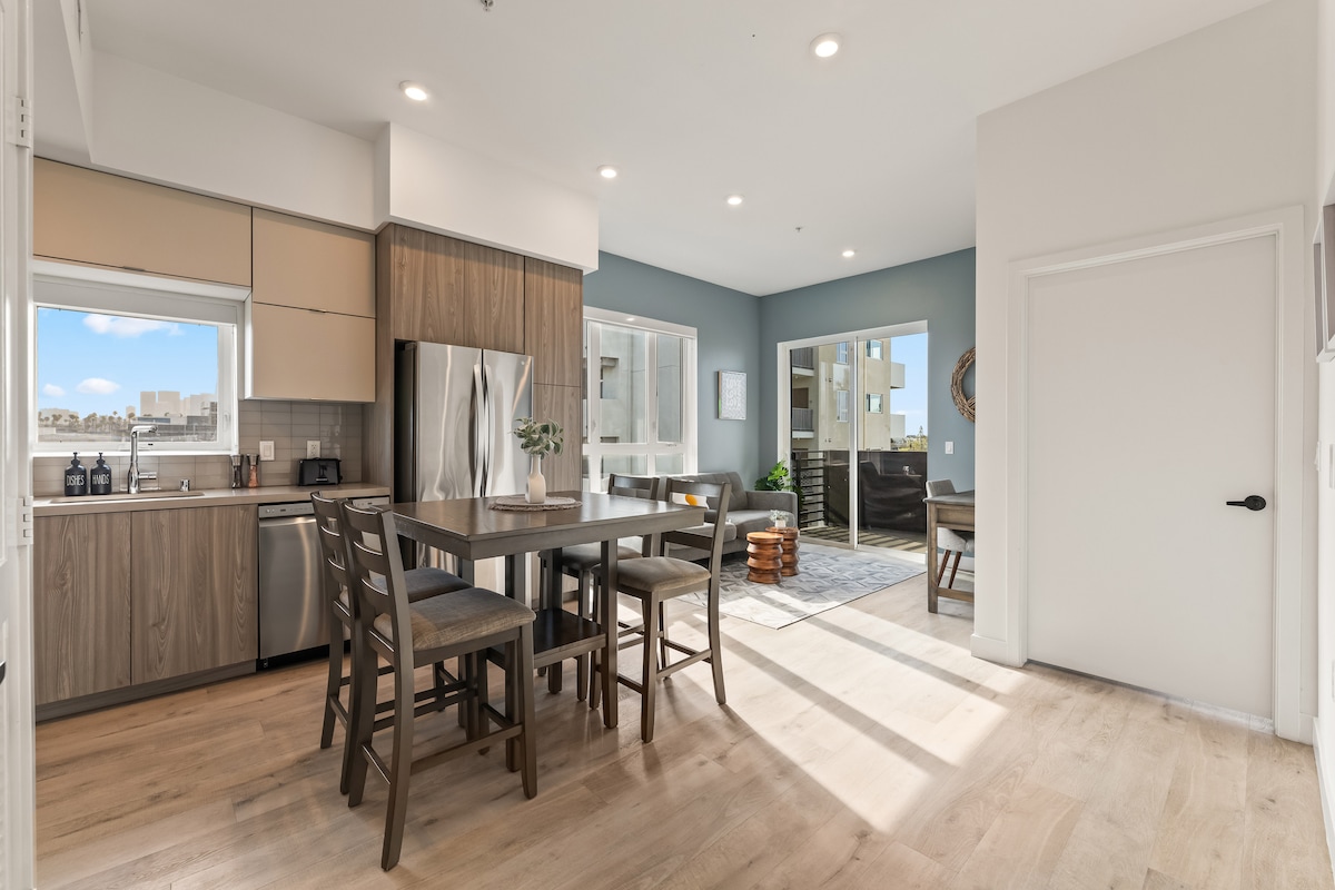 歡迎來到您寧靜的洛杉磯度假勝地! 這間光線充足、現代化的1BR/2BA公寓位於韓國城的豪華建築內,僅在旅行時可供使用。 該空間非常適合獨自旅行者或情侶入住,配有落地窗,可欣賞棕櫚樹景觀、全功能廚房、兩間全功能浴室(其中一間配有浴缸)、室內洗衣機/烘乾機和寧靜簡約裝飾。 房客可以使用高檔設備與服務,包括屋頂休息室、健身房和共享工作空間。 禁止攜帶寵物。最多2位旅客。