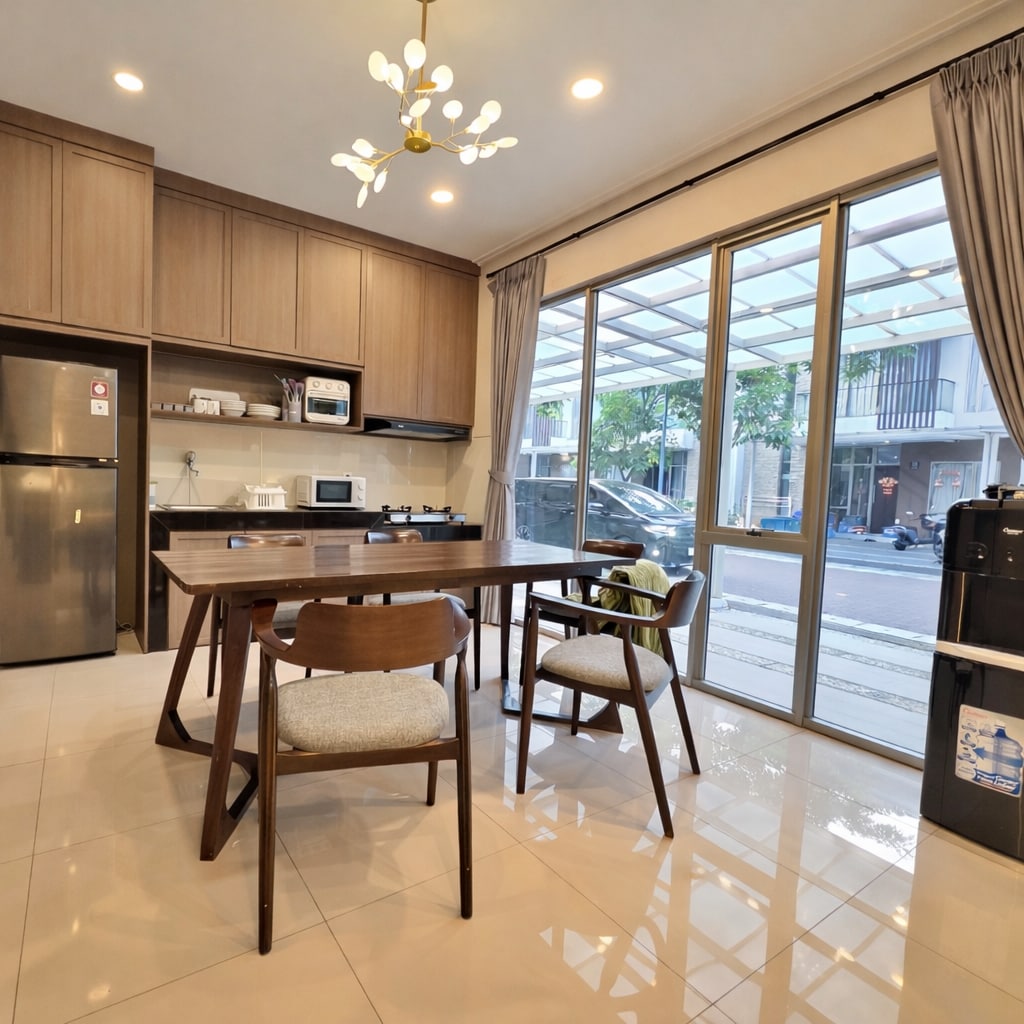 A stylish 2-story, 3-bedroom home, just 3 minutes from Dragon Point PIK2 and 5 minutes from IDD (Indonesia Design Centre). The house boasts an open-concept living and dining area with a sophisticated black-toned & noir-inspired aesthetic, creating a sleek and luxurious atmosphere—perfect for families or groups. Experience modern living at its finest, with easy access to Jakarta's newest attractions, shopping, and dining.