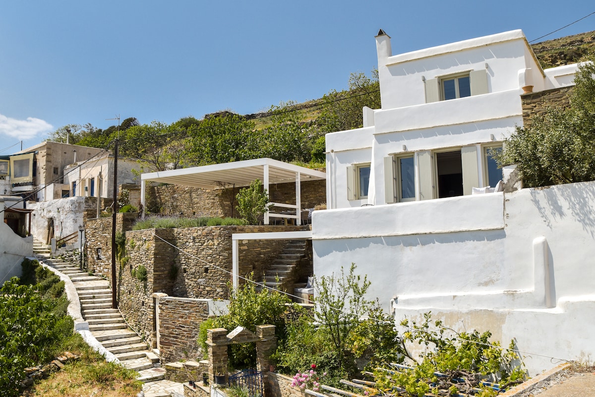 步入位於Ktikados村邊緣的獨特修復的傳統基克拉迪克房屋。放下行李,打開通往露臺的雙門,欣賞山海環抱的景色! 房源由一系列露臺組成,非常適合戶外用餐、休息和欣賞無與倫比的日落景觀。 白天,您可以期待島上獨特的當地烏鴉飛過,日落後,山谷羊群在月光下造訪。