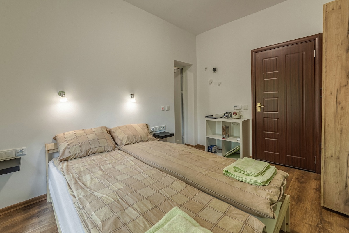 New, modern 2 bedroom apartment of 65 sqm located 3min by walk from city center with free parking. Amazing location: ideal for couples, solo/business travelers. Comfortably fits up to 6 people. The apartment has two large bedrooms with big double beds, bathroom with tub, guest toilet, fully equipped kitchen, living room with a big cosy convertible sofa, Smart TV, free WIFI, washing machine & dryer, balcony, parking. Shops & bars/cafes near apartment.