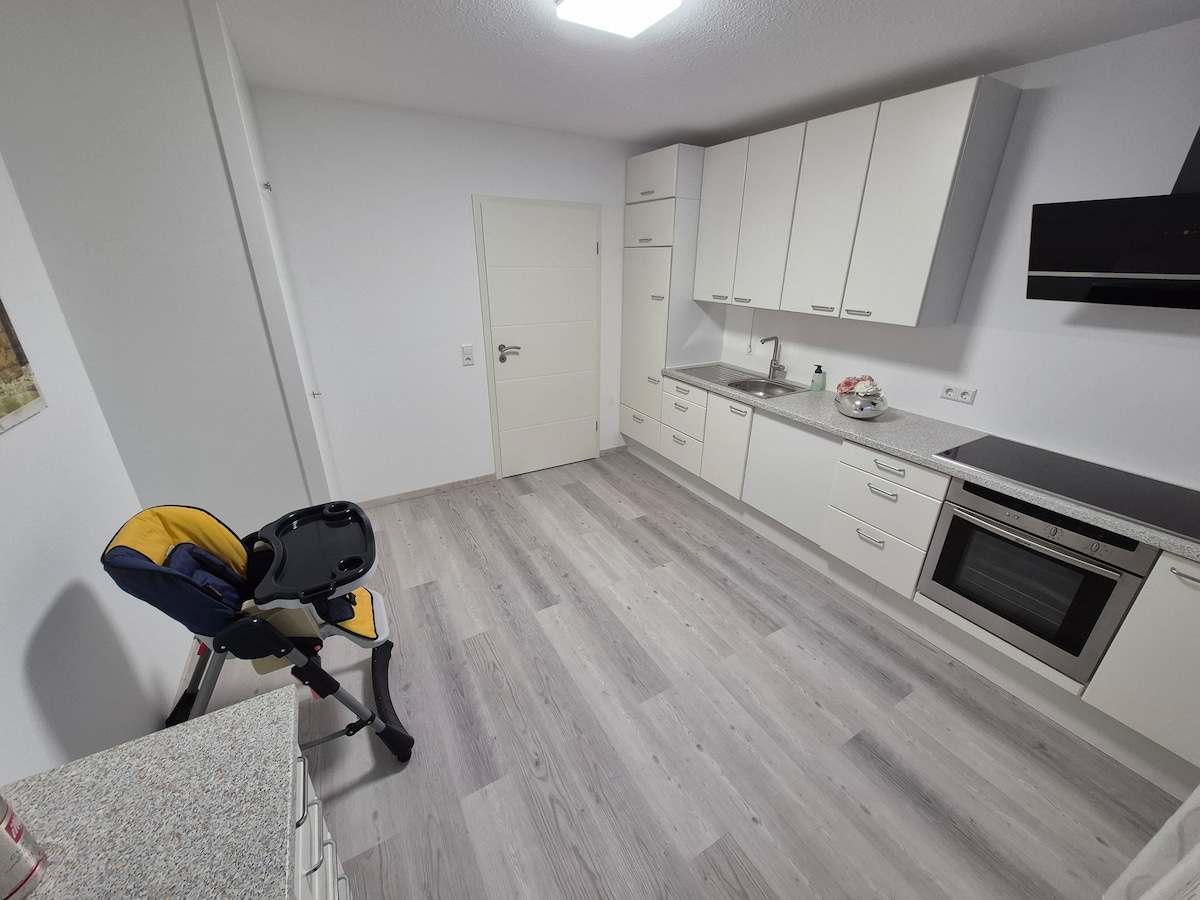 現代、陽光充足的公寓100平方公尺, 2位房客, 1間臥室、1間帶桑拿的浴室、1間客廳、廚房、陽臺、 免費停車位。最少預訂: 3天 我們很樂意在Wiesloch火車站搭乘火車接送旅客。 裝潢舒適的公寓位於我們兩戶住宅的二樓,有自己的入口,可欣賞Kraichgau山的廣闊景觀,以及位於死胡同中的安靜位置。 房子由太陽能和沼氣供暖。