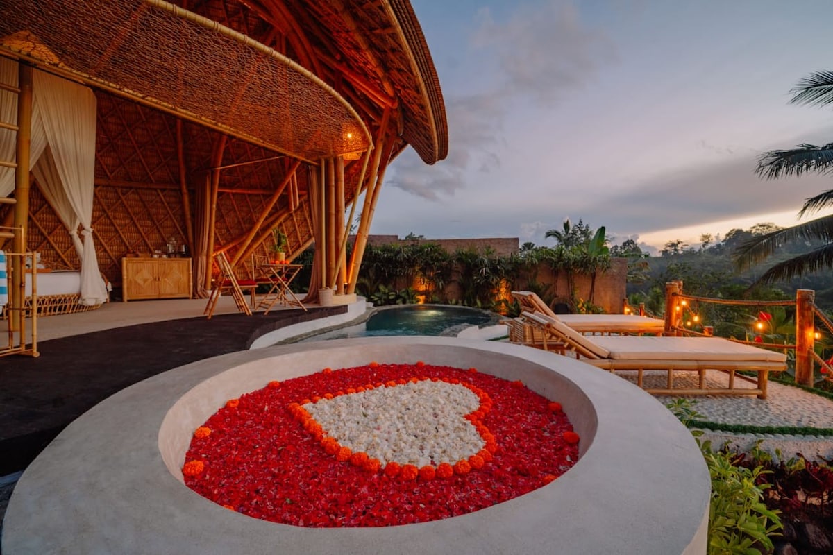 Experience ultimate relaxation in the heart of Bali at exclusive luxury bamboo villa in Sidemen. Wake up to a breathtaking view of Mount Agung right from your bed, and unwind in your private Jacuzzi hot pool surrounded by lush nature. Enjoy a complimentary breakfast each morning, and savor delicious meals at our restaurant prepared with fresh, organic produce from our own farm. A dedicated butler is always on hand to make your stay seamless and truly indulgent.