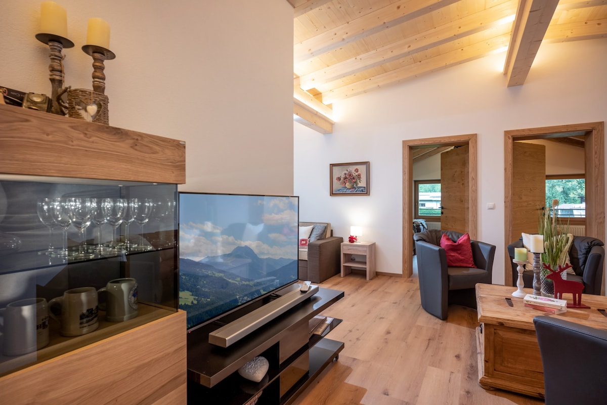 Wildschönau獨家80平方公尺公寓:兩間臥室和客廳–均配有智慧電視–壁爐、設備齊全的廚房和餐廳,可容納6人。 現代化的浴室,配有大淋浴間、Déesse天然化妝品、吹風機、直髮器和捲髮器。 嬰兒:嬰兒床、嬰兒監視器、浴缸、濕紙巾、高腳椅、餐具、小瓶加熱器和尿布桶。 歡迎狗狗入住。露臺有花園、燒烤、日光浴床和按摩浴缸,可欣賞美妙的山景。包含停車位和WiFi。