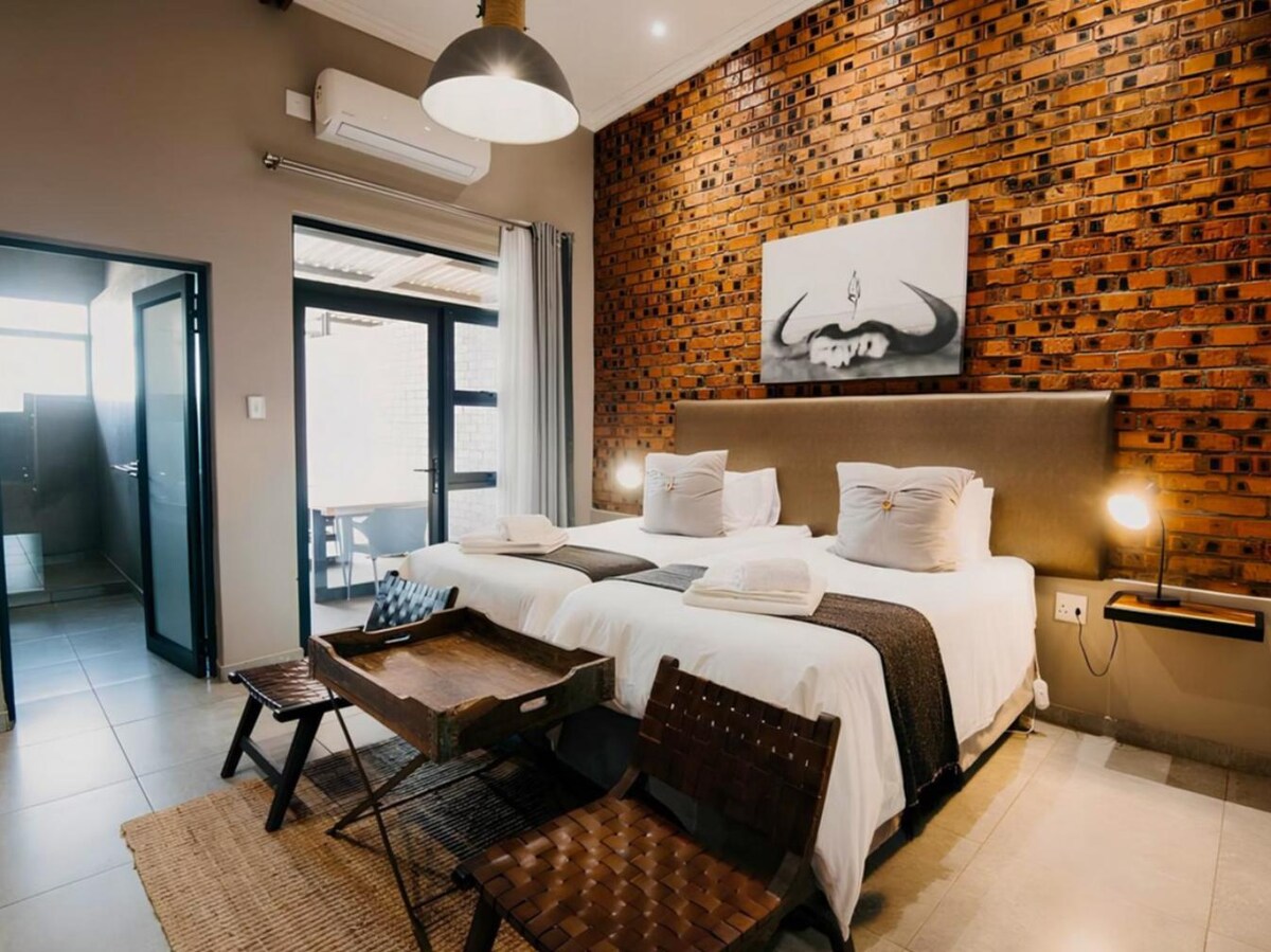 這間舒適的房間配有兩張單人床和一間帶淋浴的套房浴室。 房間配有空調、電視(配有DStv)、Wi-Fi、冰箱、微波爐、咖啡和茶具以及專用辦公桌。