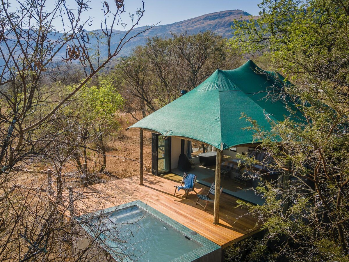 New Beginnings Couple Tent -如果您知道Sasi Bush Lodge ,以及您可以從那裡欣賞古老搖滾藝術的宏偉洞穴,您將了解這個名字的重要性。 私人泳池、山景、小廚房和加大雙人牀為這次奢華的住宿增色不少