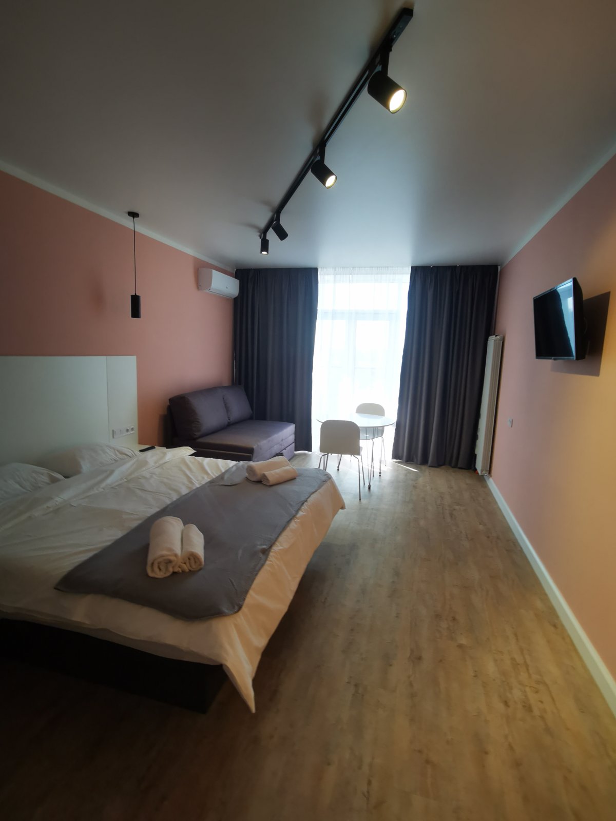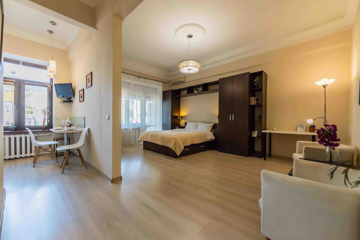歡迎來到這間豪華迷你單間公寓,2021年在基輔市中心新裝修。大床和床墊(160x200)由主要酒店經營者的供應商定制設計。公寓的窗戶有三層玻璃,所以儘管在市中心,公寓非常安靜。廚房設備齊全。洗衣機可供您使用,並提供洗衣精。現代化的乾淨淋浴間配有液體洗髮精/沐浴露。14: 00後輕鬆自助入住。