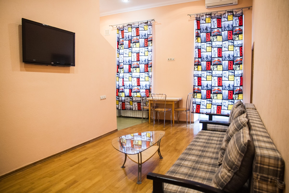 舒適、小巧、舒適的兩層閣樓單間公寓位於1917年建造的歷史建築的4樓,位於基輔市中心,靠近歌劇院和Khreshchatyk街。步行5分鐘即可抵達附近的「大學」地鐵站。這間公寓是一家小型公寓式飯店的一部分,有6間客房。公寓內有一張加大雙人床,夾層上有高品質的床墊。單間公寓有自己的小廚房和自己的浴室,配備您需要的一切。