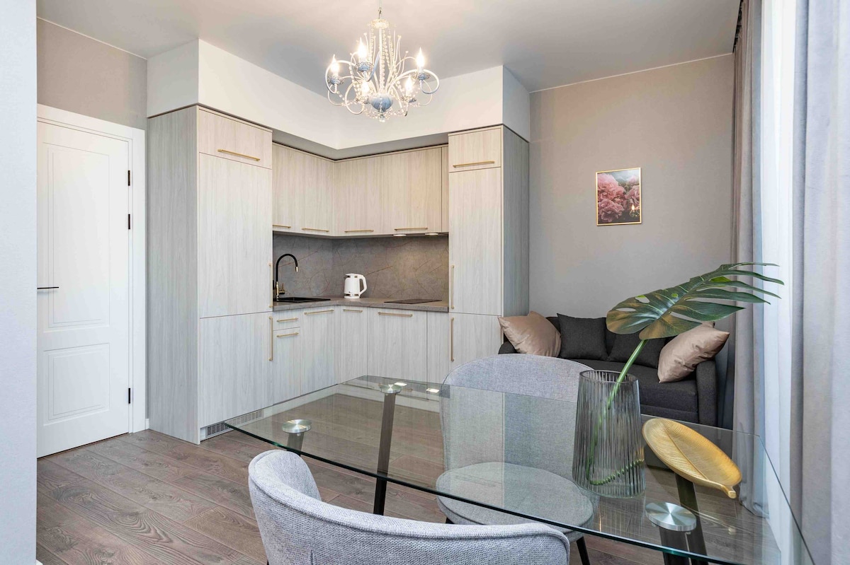 兩間臥室公寓,配有客廳和開放式廚房、大型開放式陽臺、高速WiFi和智慧電視。這是一棟新建築,樓下有 24 小時全天候禮賓服務。