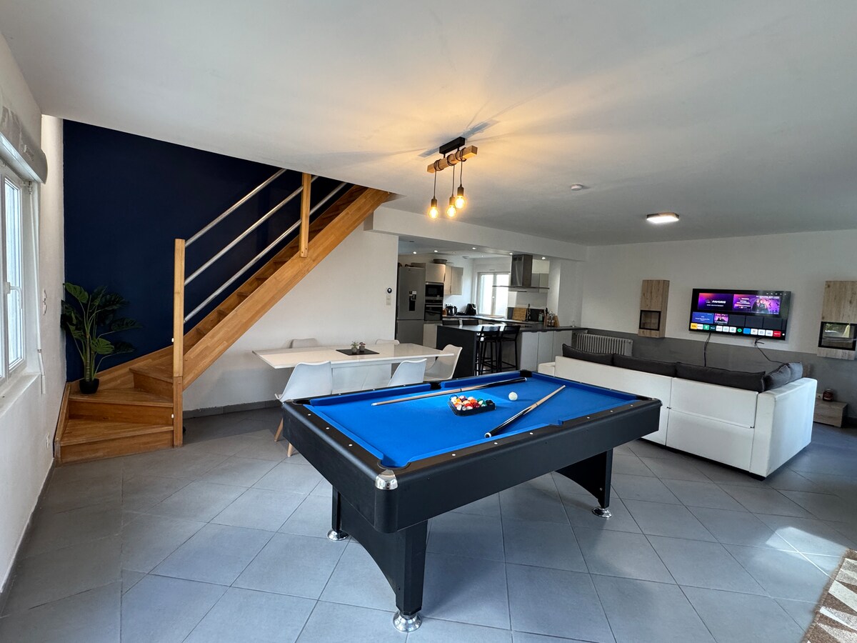 Située dans un quartier calme, cette maison spacieuse est idéale pour un séjour en famille ou entre amis. La maison comprend : 🛏️ 3 chambres : 2 chambres avec lits doubles 1 chambre avec un canapé lit et un lit bébé 🛁 Une grande salle de bain avec tout le confort nécessaire 🍳 Une cuisine entièrement équipée (plaques, four, micro-ondes, lave-vaisselle, machine à café, etc.) 🎱 Un salon convivial avec billard et télévision Jardin clos avec toboggan pour les enfants.