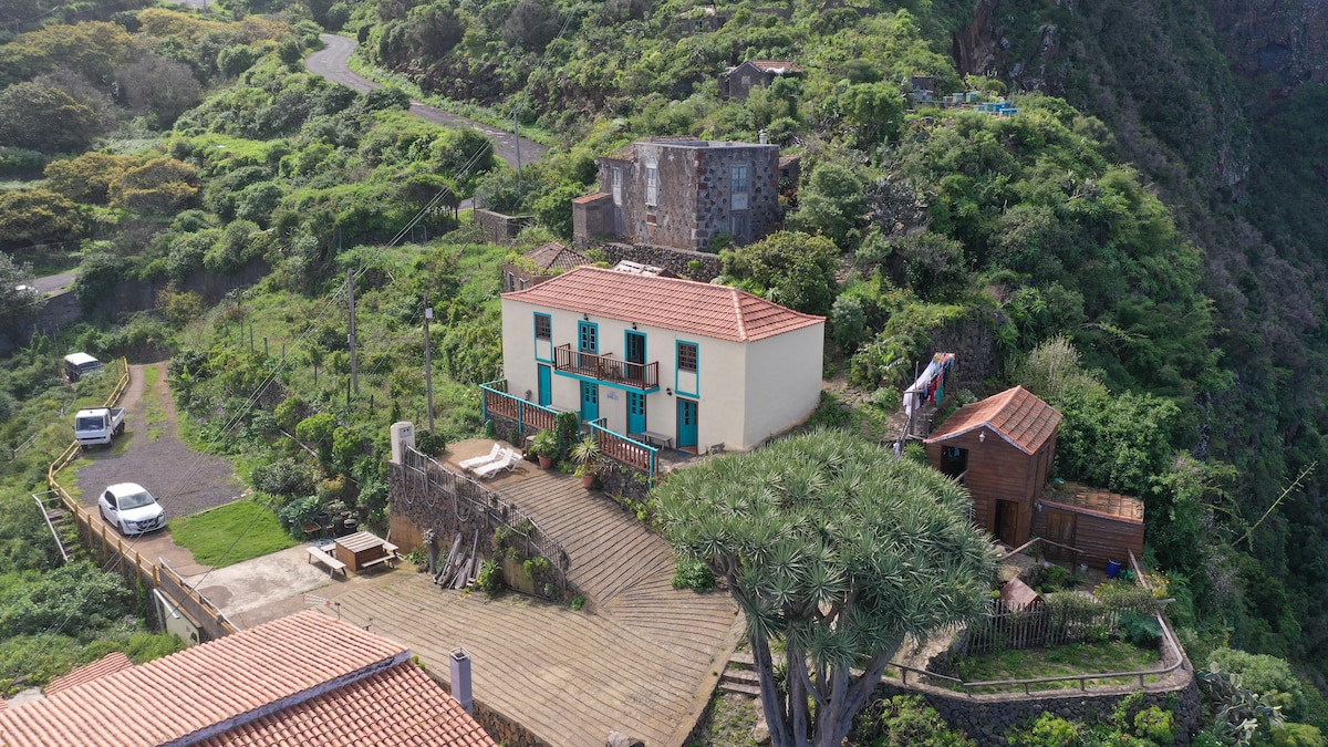房子位於Fagundo峽谷和GR130海岸的皇家公路的腳下,是徒步旅行者和賞鳥的最佳選擇之一。 Tablado坐落在Garafia的中心。 四周環繞著島上最深的兩個峽谷( Fagundo和Los Hombres ) ,可欣賞壯麗的海景和山頂。 這個組合在海拔400公尺,讓它極其綠色,全年氣候溫和穩定,非常適合種植熱帶作物。