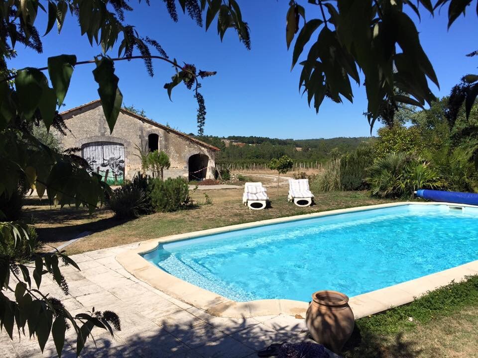 Great for families or couples, our home is set in beautiful Charentais countryside. Super location for visits to local lakes and riverside beaches, market towns, Cognac, Bordeaux, St Emilion, the coast....or just relax! We offer comfortable accommodation in an apartment over two floors overlooking the pool and garden for your exclusive use.