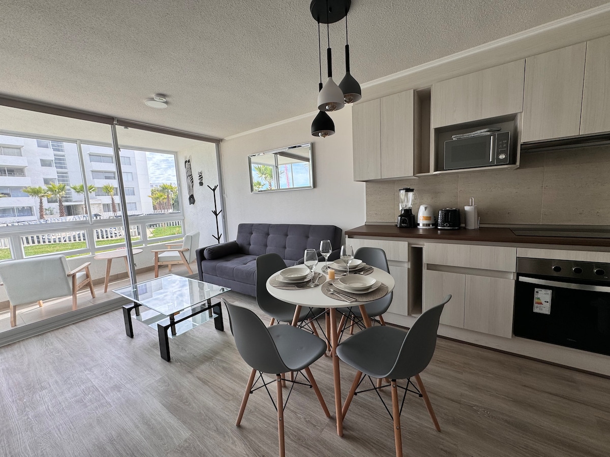 Departamento nuevo, moderno, acogedor e iluminado. Emplazado en cond. Marina Costa, atrás de Enjoy. Camino directo a la playa, la mejor ubicación para tu descanso. Depto habilitado con lo mejor en calidad y diseño para asegurar descanso y comodidad. Ropa de cama y toallas incluidas, así como artefactos de baño y cocina. Cuenta con Internet, Netflix, Amazon Prime y Disney Plus. Estacionamiento bajo techo. Malla de seguridad en balcón. Piscina, quincho, sala multiuso y lavandería.