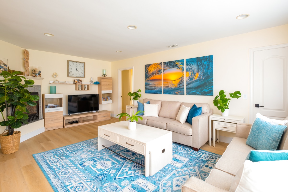 由太平洋海灘奢華舉辦體驗。 這間新裝修的寬敞4間臥室2.5間浴室房源位於北太平洋海灘的一條安靜街道上,距離海灘僅2個街區,配有大廚房、中央空調、全新浴室、車庫和大院子,配有按摩浴缸、燒烤和戶外座椅。 非常適合家庭在海風和加州陽光下放鬆身心。 提供海灘/嬰兒裝備。 專業清潔。網速為500Mbps。