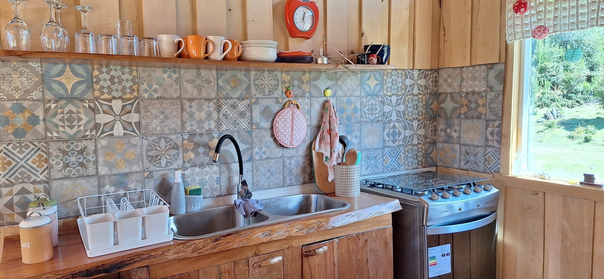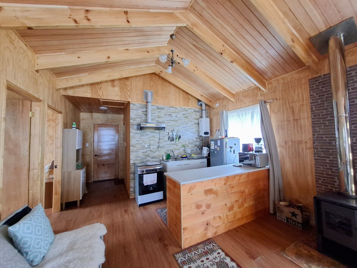 從這個住宿地點可輕鬆前往所有地方。 小木屋,有 2 間臥室,配備廚房、智慧電視、所有空間都有 WiFi、床暖器、木柴暖氣、洗衣機和烘乾機,無需額外費用。 室內停車位、熱水、吹風機、床單。 距離迷你市場 100 公尺。 從小屋看不到大海,但如果步行 200 公尺,您將面對 Puyuhuapi 海灣。