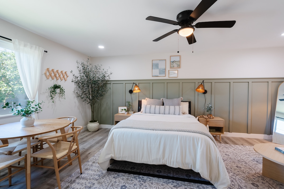 Welcome to our charming California studio that we designed to be comfortable, convenient and eco-friendly! It's tucked away on a quiet alley in a family-friendly, suburban neighborhood, offering plenty of privacy and parking! You’ll have everything you need here, including fast Wi-Fi, laundry machines, and a full kitchen. Whether you’re heading out for an adventure or staying in for a quiet evening, this studio is the perfect spot. We’d love to host you!