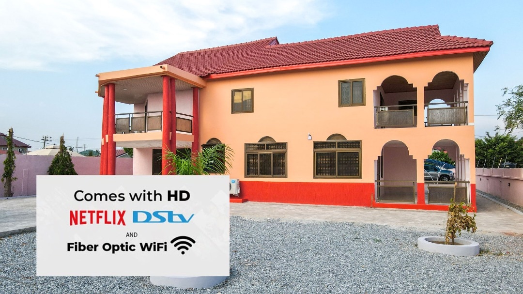 The solar-powered apartment is situated in a serene gated estate, fully air-conditioned and consisting of 2 bedrooms, a living room with a flat-screen TV with satellite channels, a fully equipped kitchen with a fridge and microwave and 2 bathrooms with a shower. The facility has 24/7 security and 5G internet to stay connected with your friends and partners across the globe. The apartment is about a 15-minute drive from the Kotoka International Airport, Accra.