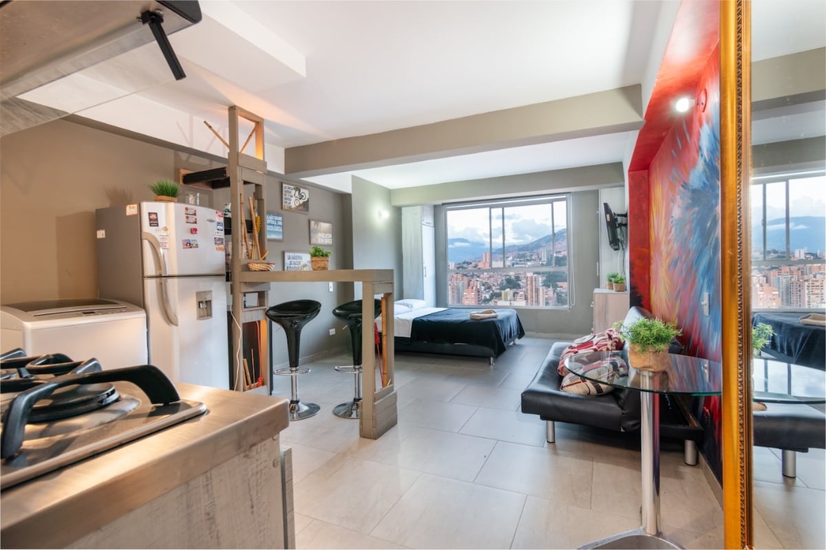 🛎️ Pay 0% service fee on Airbnb! 🛎️ ✨ Exclusive benefit for our guests ✨ Stay in a modern studio on the 26th floor with stunning panoramic views of Medellín. Fully furnished and equipped, perfect for both short and extended stays. 🌆 Located in a safe residential area with 24/7 front desk, surrounded by shops and residences. Just steps from restaurants, supermarkets, the tram, and only minutes from the metro, with taxis and buses right at your doorstep for easy city access.