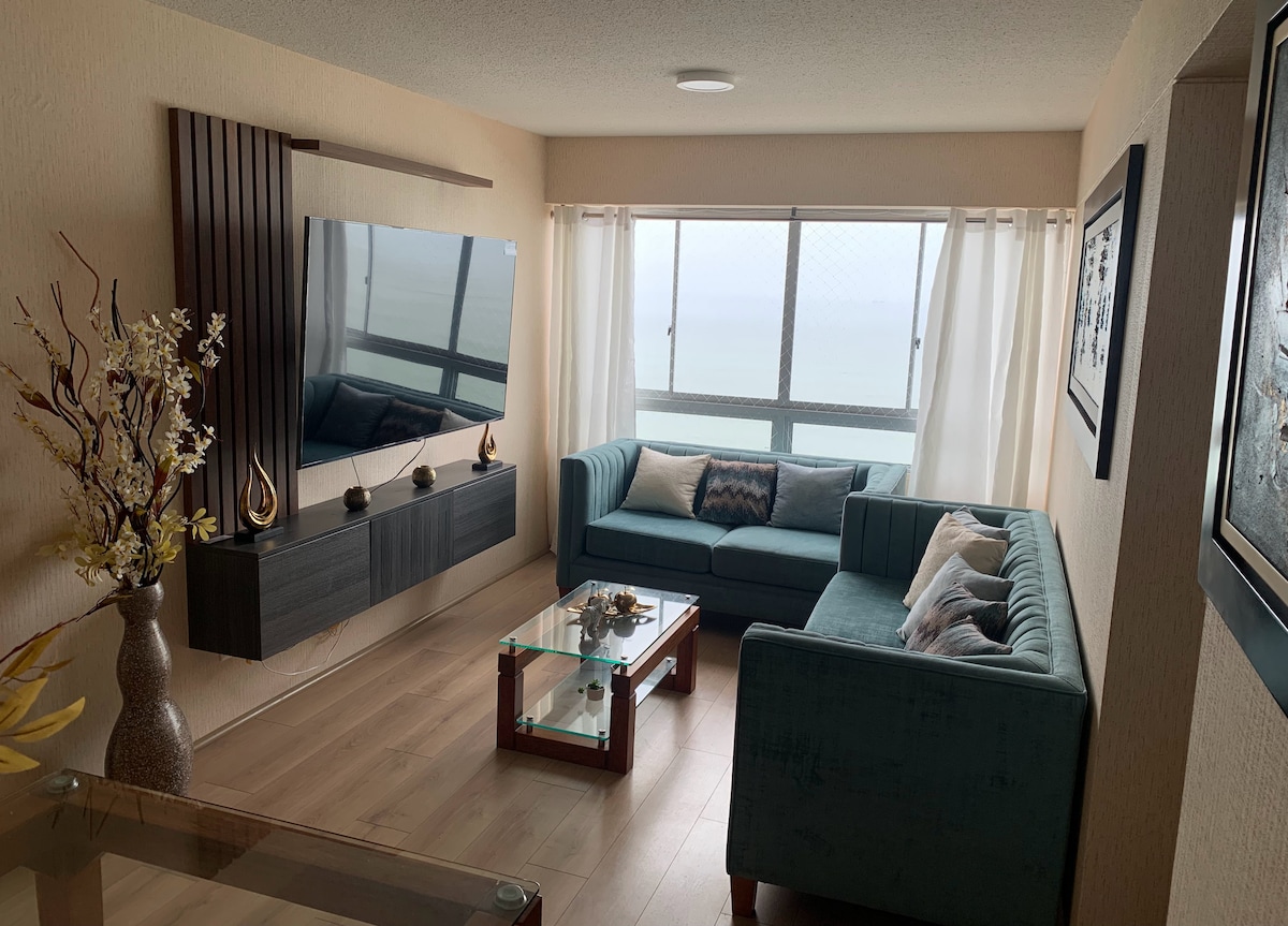 This apartment stands out from the rest because it has a FRONT OCEAN VIEW from every room. It's the perfect combination of palm trees and Caribbean-style sea, but in the Peruvian capital. It's a PREMIUM experience. - The Green Coast at 300 m² - Cafes and shops at 50 m² - A 10-minute drive from Lima's most touristy districts: Miraflores and Barranco. - Close to Lima's best restaurants. - Public transportation at 50 m² - In front of a Malecón (residential area) We look forward to seeing you!