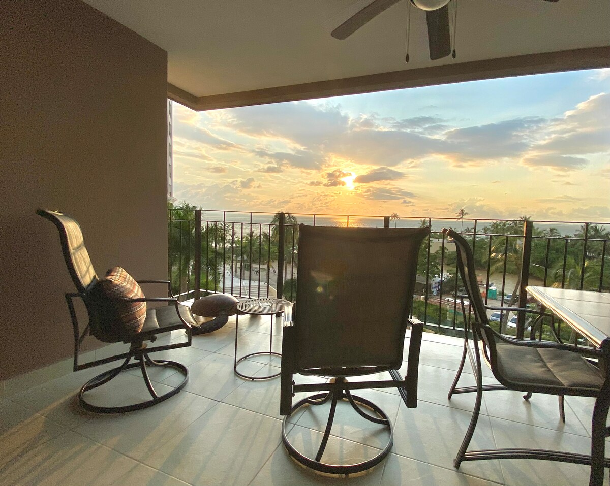 從這間位於14樓的海濱公寓欣賞令人驚嘆的美景,在陽臺上放鬆身心,一邊喝著飲料,一邊欣賞班德拉斯灣的美景、令人驚嘆的日落和清爽的海風。 注意:雖然在Sunscape度假村旁邊,但公寓不授予進入度假村泳池或公共區域的權限。 寬敞的臥室配有一張加大雙人床和一張雙人床,起居區包括小廚房、舒適的座位、高級電視和串流、WiFi。步行10分鐘即可抵達海灘