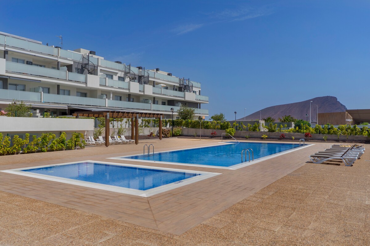 現代化全新公寓,位於自然保護區紅山的Tejita海灘前面(距離200公尺)。 您可以直接從大露臺欣賞美麗的海景和紅山。兩個溫水遊泳池(兒童和成人)讓您全年享受遊泳。 商店和餐廳距離公寓100公尺。距離高爾夫球場僅3公裏。1公裏內的衝浪區。100公尺內有巴士和計程車站。
