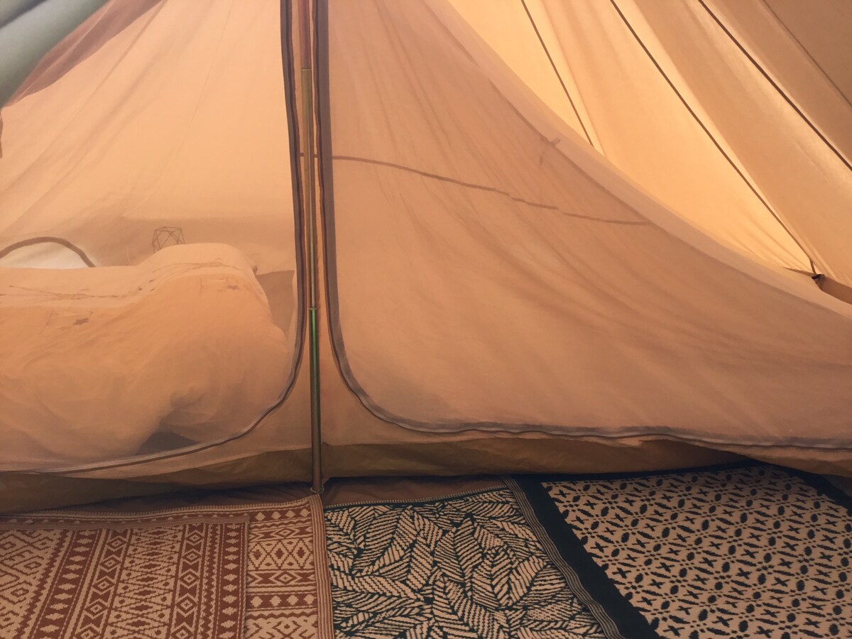 Grande tente avec lit de 140 pour 2 personnes avec un coin détente et de quoi manger à l extérieur , grand espace tranquille sur propriété privée , vous disposez d une salle d eau et de toilette