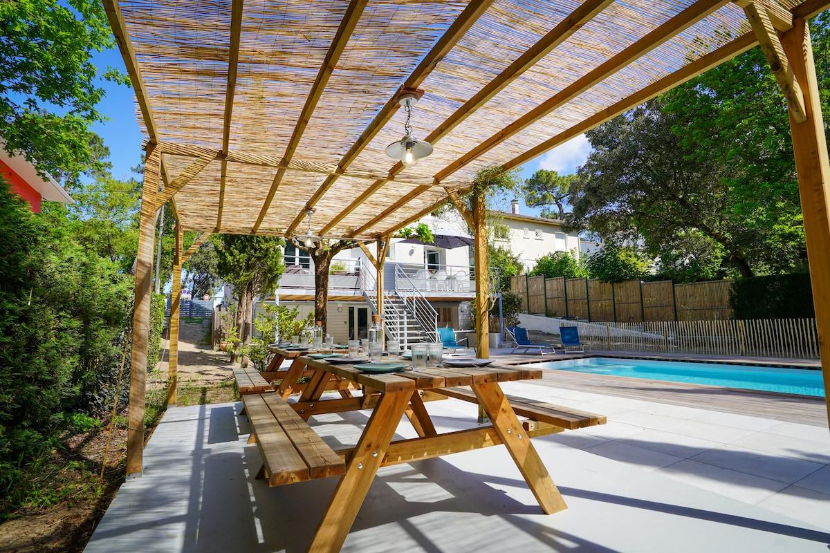 大家好! 距離大西洋十分鐘路程,冥想別墅「Le Lucat」歡迎您來到這座建築師設計的房屋。 高級、令人陶醉的氛圍,無對面建築,位於森林中,距離市中心 2 分鐘! 200 平方公尺的住宅,配備光纖網路、4000 平方公尺的公園、溫水泳池、3 間浴室、3 間廁所、1 間室外冷熱淋浴間、230 平方公尺的設備齊全的露台。 還有一間冥想室,可提供服務或不提供服務!