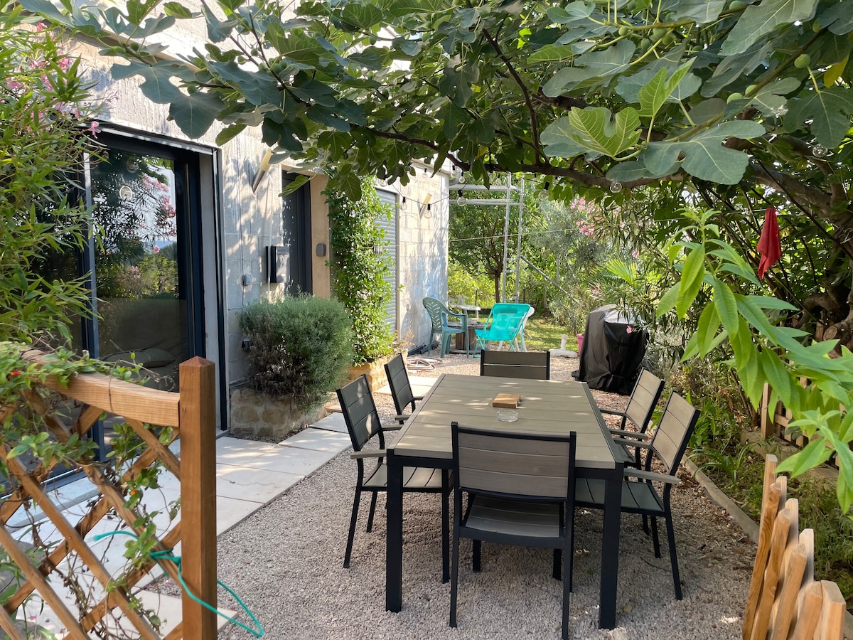 3 km from Aubagne and its santonniers, 30 minutes from Aix-en-Pce and its historic center, 30 minutes from Marseille and Mucem, 30 minutes from Cassis and its Calanques and 20 minutes from La Ciotat and beaches, our small Provençal house of 35 m2 is comfortable and cozy, with its parking, its loggia, its pretty shaded garden of 1000 m2 and its breathtaking view of the hills. Located opposite the site of La Font de Mai you can also discover all the hiking trails of Pagnol around Garlaban .