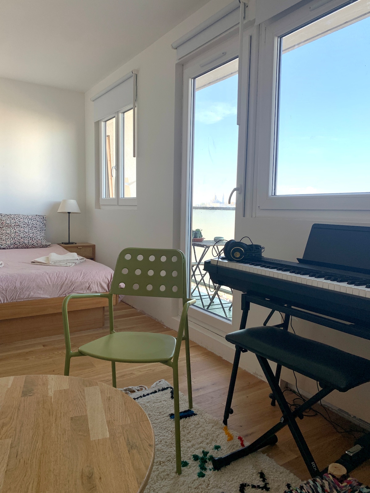 Feel like at your own « pied à terre » or base in the dynamic neighborhood of Pantin. Renovated loft-style apartment with a separate bedroom, just one minute from Hoche metro (Line 5). You can get to the city center in 15 minutes. Ideally located near Parc de la Villette, the Philharmonie, the canal, and Hermès offices. The apartment features a cozy living area, comfortable bedroom, boutique hotel-style bathroom with Italian shower and anti-fog mirror, and a fully equipped kitchen.