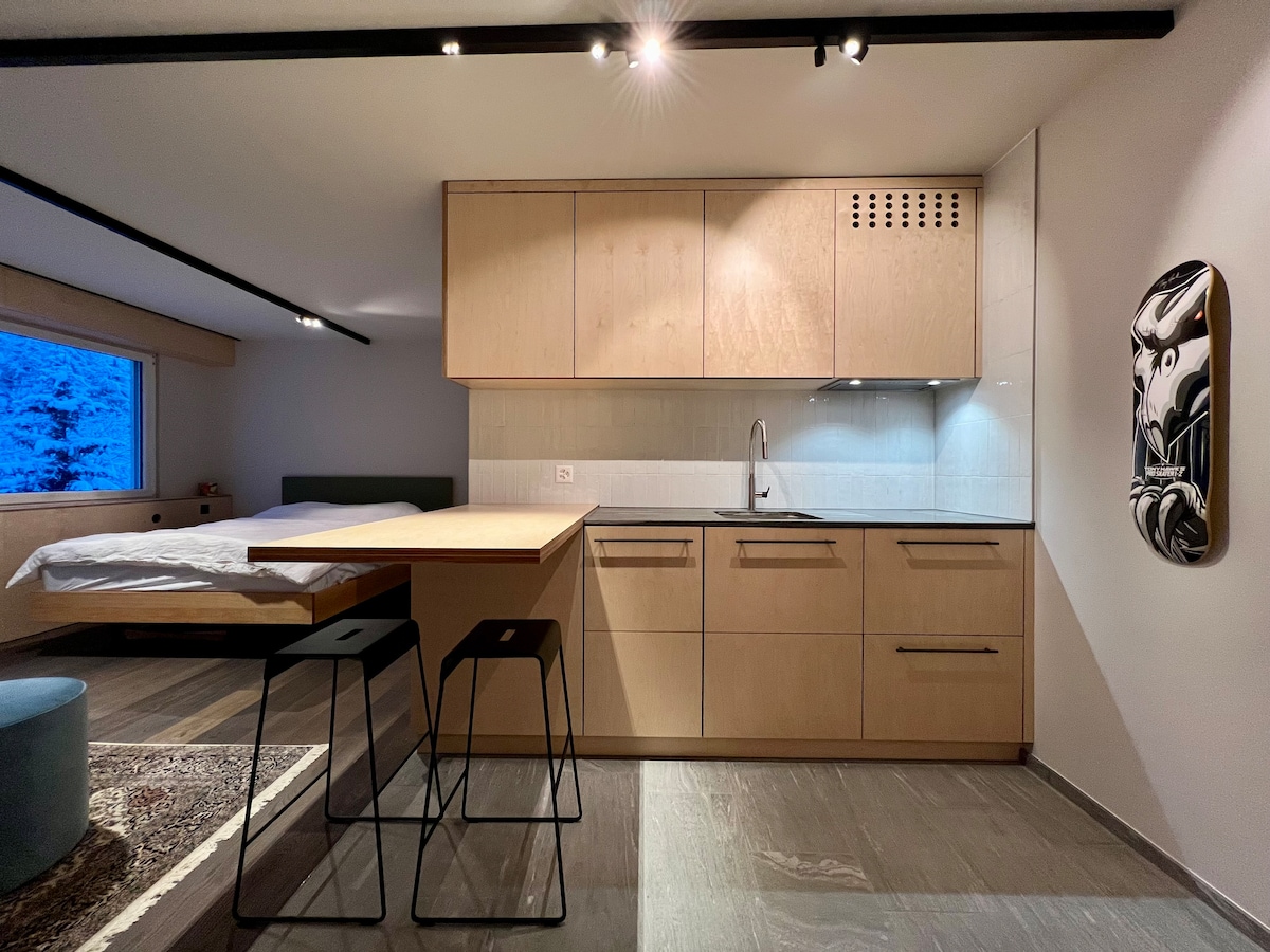 Studio in Laax with pool, saunas and mountain view near-by the ski lifts. Modern kitchen with stove, oven, dishwasher, refrigerator, Nespresso coffee maker, dining table with chairs. A premium King size bed (180cm x 200cm), a Sofa bed couch and a 50’’ inches wall digital smart Samsung TV, Wi-Fi and global channel package. The apartment has a sunny oriented balcony; all lights are dimmable to maximize living comfort during the different hours of the day. Guest Card incl. Free outside parking!