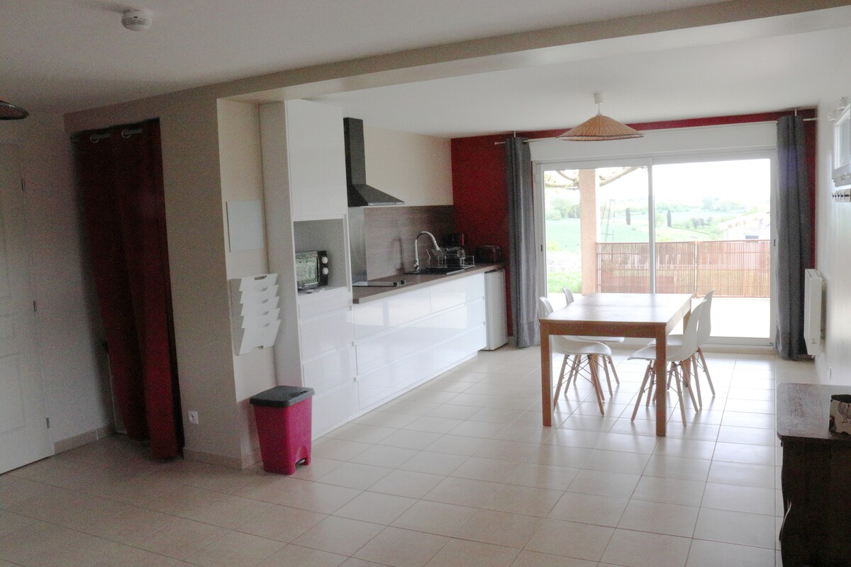 Studio de 30m² au RDC de notre maison mais totalement indépendant. Calme de la campagne avec vue dégagée sur le Lauragais, mais à moins de 5km de l'entrée de Toulouse. Centre commercial Leclerc Saint Orens à moins de 5km Centre commercial Carrefour Labège, Labège Innopole à 8km Bus (ligne 201) à 250m Terrain de pétanque, piste d'athlétisme, terrain de foot, à 100m Skatepark, Fitpark et parc pour enfants à 400m