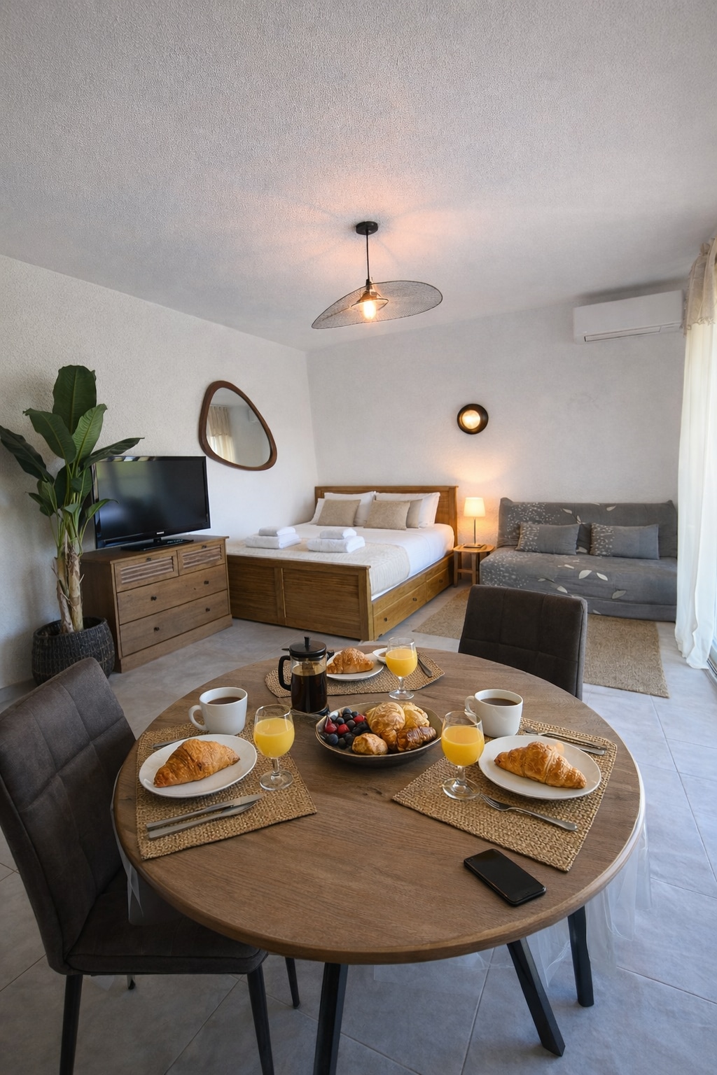 Tournesol套房非常適合一對夫婦入住;40平方公尺,包括廚房、臥室/客廳和帶櫥櫃的大廳、帶淋浴的浴室、獨立廁所、收音機和電視。寬敞的30平方公尺露臺,可欣賞呂貝宏山脈的全景。套房設備齊全,配有咖啡/茶、浴袍和厚實的毛巾。天花板上安裝了高效的電風扇。 如果您想坐在噴泉旁邊,您會在大廳找到額外的椅子!
