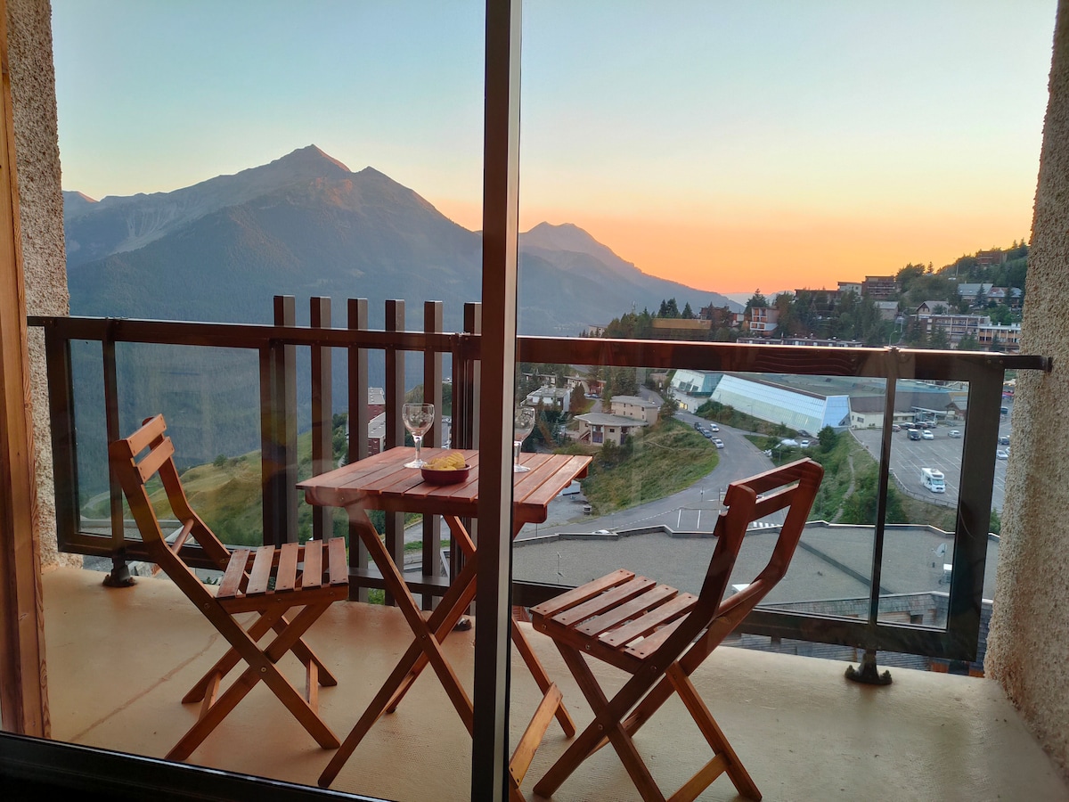 Orcières Merlette的溫馨單間公寓,可供5人入住,稍微偏離市中心,安靜,附近有電扶梯,可直接前往度假村中心。 步行5分鐘即可抵達Jardin des Piou-Piou ,非常適合家庭入住。 享受山景、陽光明媚的陽台、設備精良、靠近穿梭巴士和斜坡。 非常適合滑雪、健行或放鬆入住。 🗓️請注意:聖誕節、新年和2月的4週期間,預訂僅限週六至週六。
