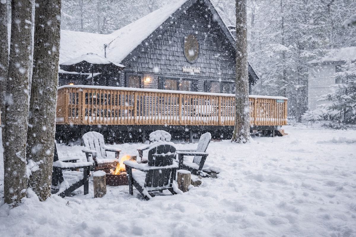 這座令人驚嘆的小木屋坐落在波科諾山脈。 您的週末度假或全年長期住宿的目的地! 在外面,您可以在美麗的1英畝私人林地、按摩浴池、兩個火坑、早晨咖啡的露臺或美味的燒烤中享受自然環境。 我們的房源提供寧靜的室內氛圍,地理位置方便,靠近所有波科諾山的季節性活動。無論您想放鬆身心還是充電,我們的房源都能提供完美的度假勝地。