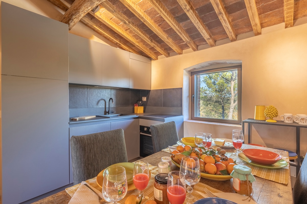 A country-chic apartment nestled in the quiet Tuscan countryside, inside a beautiful, carefully renovated farmhouse. Here, time slows down: breakfasts on the porch, relaxing by the pool, and evenings in the quiet countryside. The views of nature and the green spaces convey a sense of peace and complete harmony with the surrounding landscape. A place designed for those seeking relaxation, silence, and nature, ideal for couples and families with children aged 12 and up.