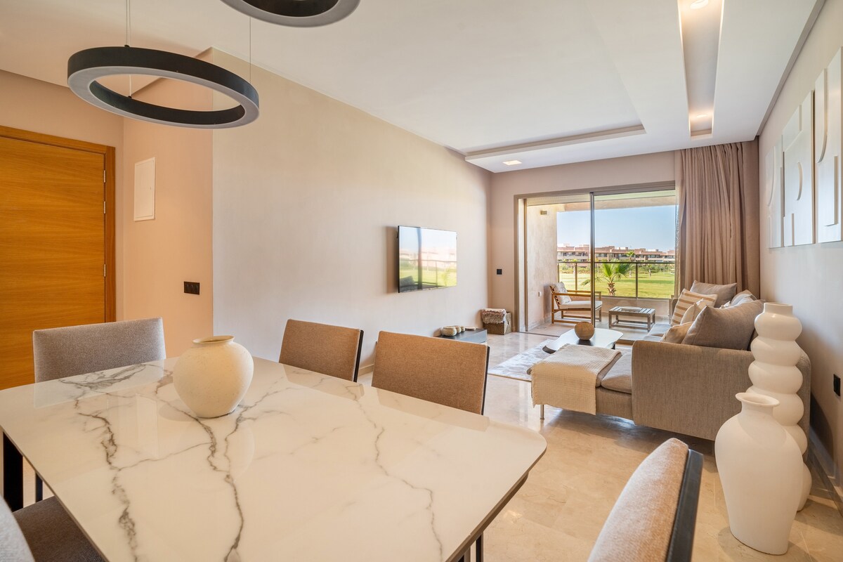 在美麗而寧靜的高爾夫度假村Prestigia加入馬拉喀什市中心!從機場開車只需5分鐘,開車前往市中心只需7分鐘,您可以輕鬆前往這間全新3臥室公寓的所有景點。 您將欣賞高爾夫球場和泳池的壯麗景色。住宅提供極佳的安全措施,確保您的住宿安全,並提供餐廳和綠地供您享用! 現在就是你的家