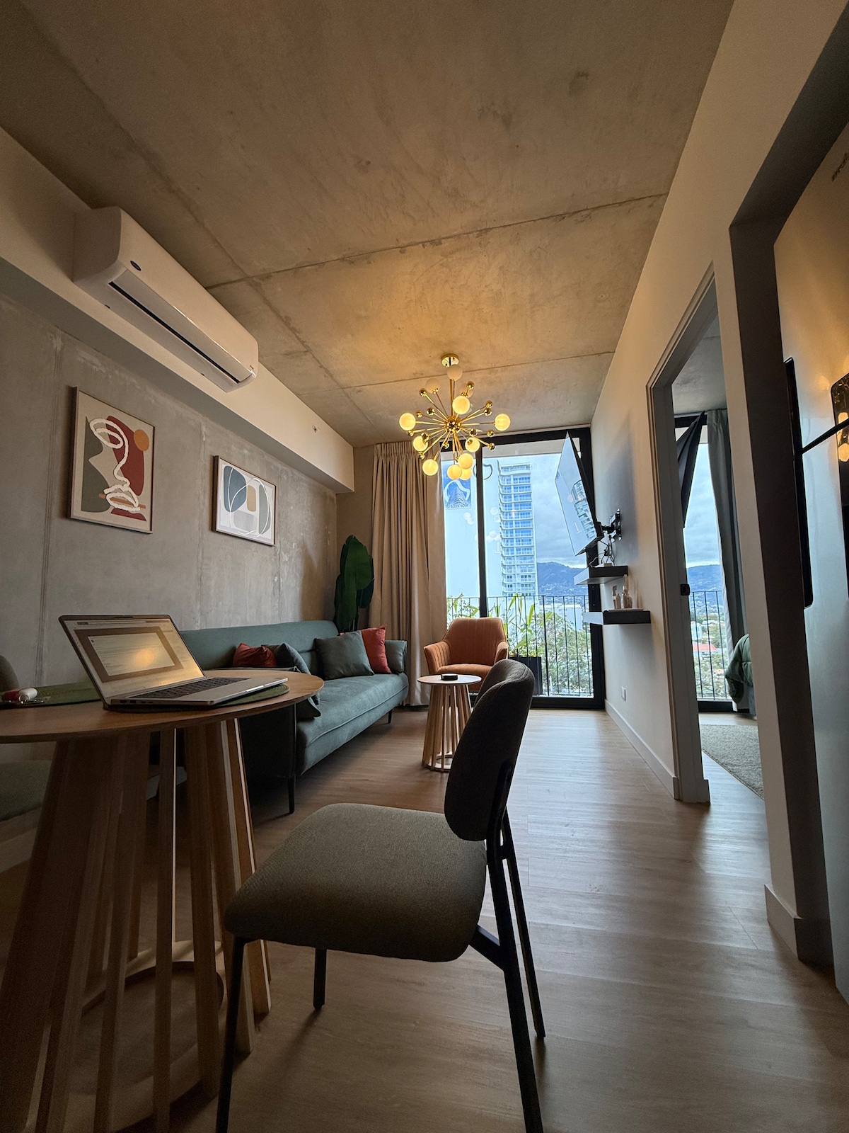 CR Stays Welcomes you to this fully-equipped studio just 4 miles from Juan Santamaría Airport. Enjoy breathtaking views of the Escazú mountains, a king bed, queen sofa bed, fast Wi-Fi, and air conditioning—ideal for 4 guests. The building boasts a gym, pool, BBQ terrace, private cinema, and meeting rooms. Minutes from Plaza Real Cariari’s shops and restaurants, and located in a prime business hub. 24/7 security for a safe, stylish, and comfortable stay.