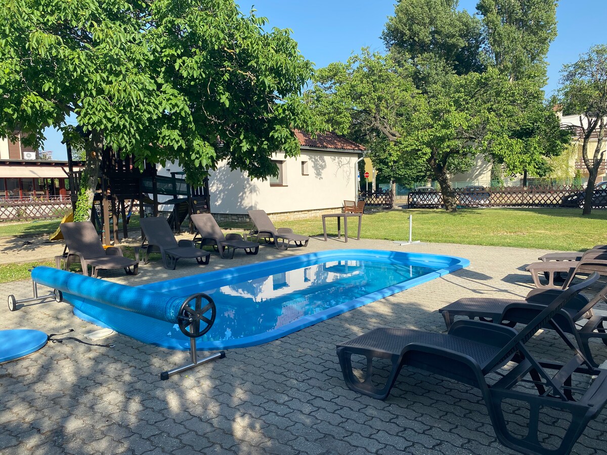 我們舒適的小屋位於巴拉頓湖畔的真正的度假小鎮菲文耶斯。 距離海灘僅300米。您可以享用兩個露臺和大花園。 有一間配有1.8公尺寬雙人牀的臥室和一間配有兩張舒適沙發牀的寬敞明亮客廳。 有很多精彩體驗,如品酒、自行車、徒步旅行、騎馬、水上運動等。 距離匈牙利最美的高爾夫球場僅2.6公裏。300米以內有露天影院。