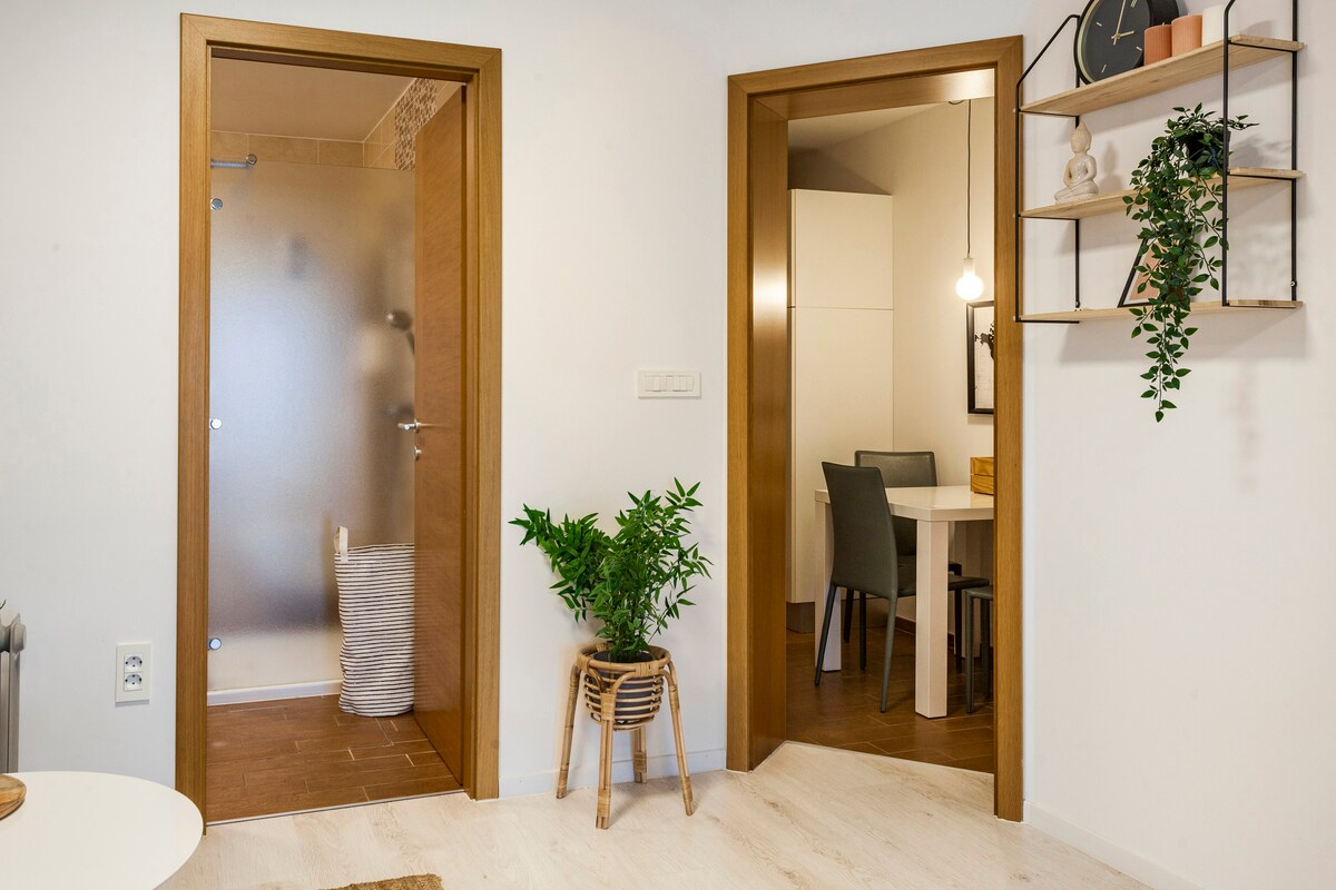 Luxury Apartment Ana at Bled has two bedrooms, one bathroom and a big living room with a kitchen and a dining room. There is a double bed in each one of the bedrooms and an expandable couch that can serve as an additional double bed in the living room. The capacity of apartment is up to four and additional two, so six persons that can sleep in it. The apartment has it's own air-conditioning, it is spacious with a lot of light and has a surface of 60 square metres.