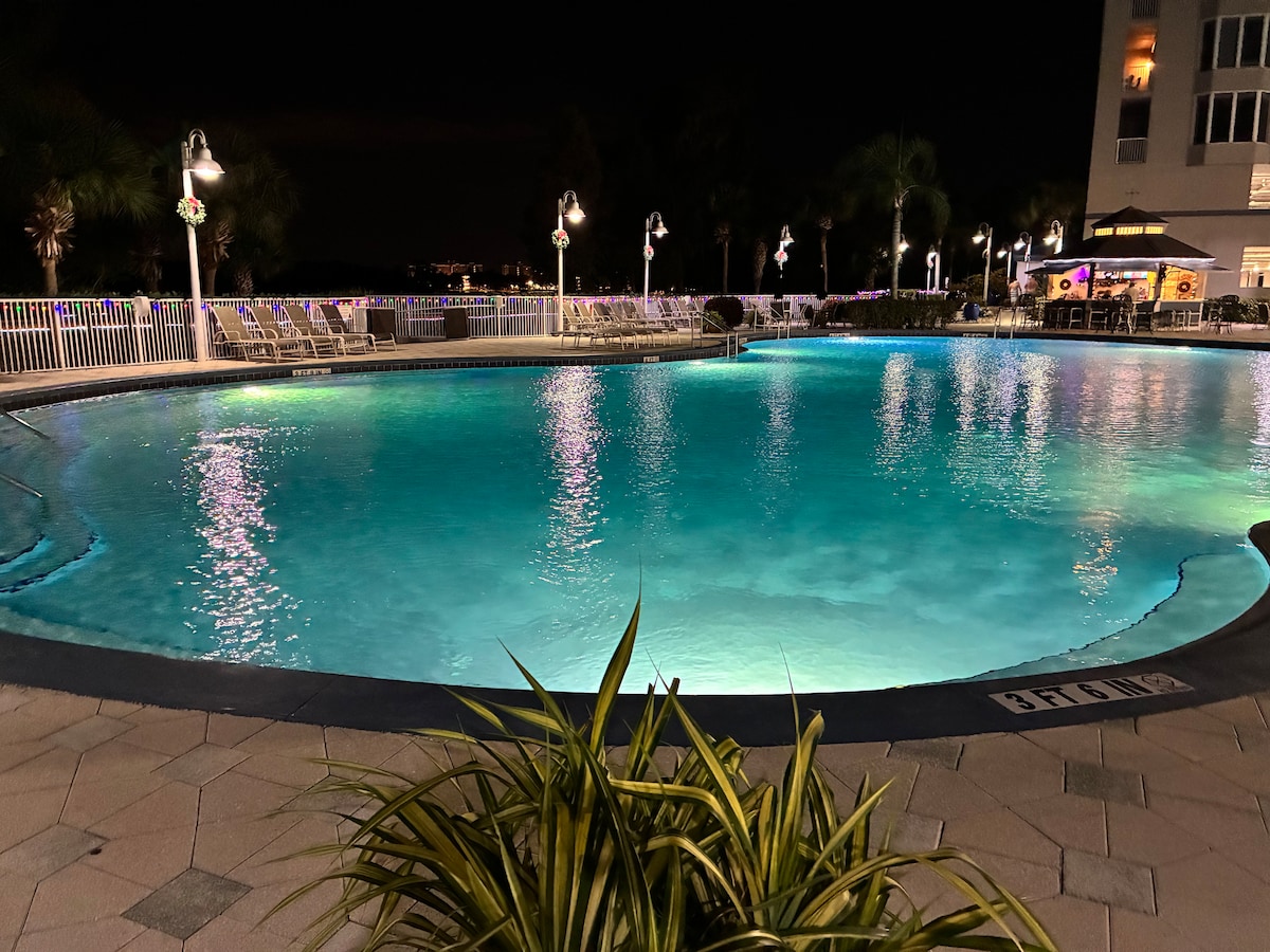 歡迎來到這座豪華的海濱公寓,俯瞰布萊恩湖和迪士尼公園,距離地面 210 英尺。從私人陽臺欣賞壯觀的日出,或在前陽臺欣賞夜晚的煙花表演。環球影城、海洋世界、樂高樂園、迪士尼泉的大商店和無盡的餐廳都很近! 可使用整個度假村,沒有隱藏費用。免費停車位、泳池、按摩浴池、健身房、遊戲廳、自然保護區木板步道、噴水浴缸等!