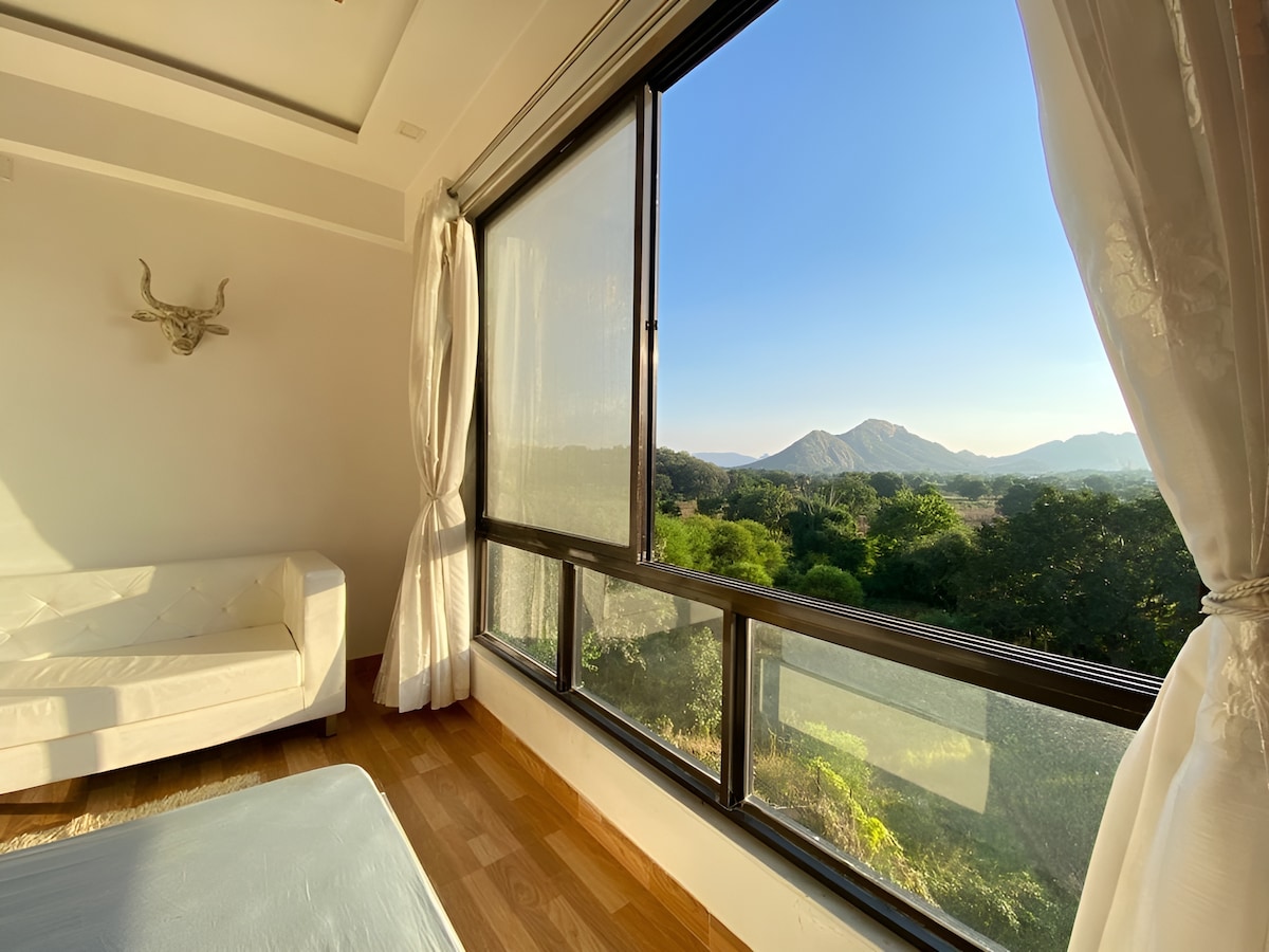 從臥室窗戶醒來,欣賞鬱鬱蔥蔥的阿拉瓦利山脈。 設備齊全的1bhk公寓位於五星級度假村內,遠離城市的喧囂。 非常適合居家度假和寧靜的假期。 由於我們最喜愛的房客之一( Lori Goldman ) ,這套公寓最近進行了設計和美學的升級。 考慮到這是她的第二個家,她增添了自己的風格,讓這棟房子變得更好。