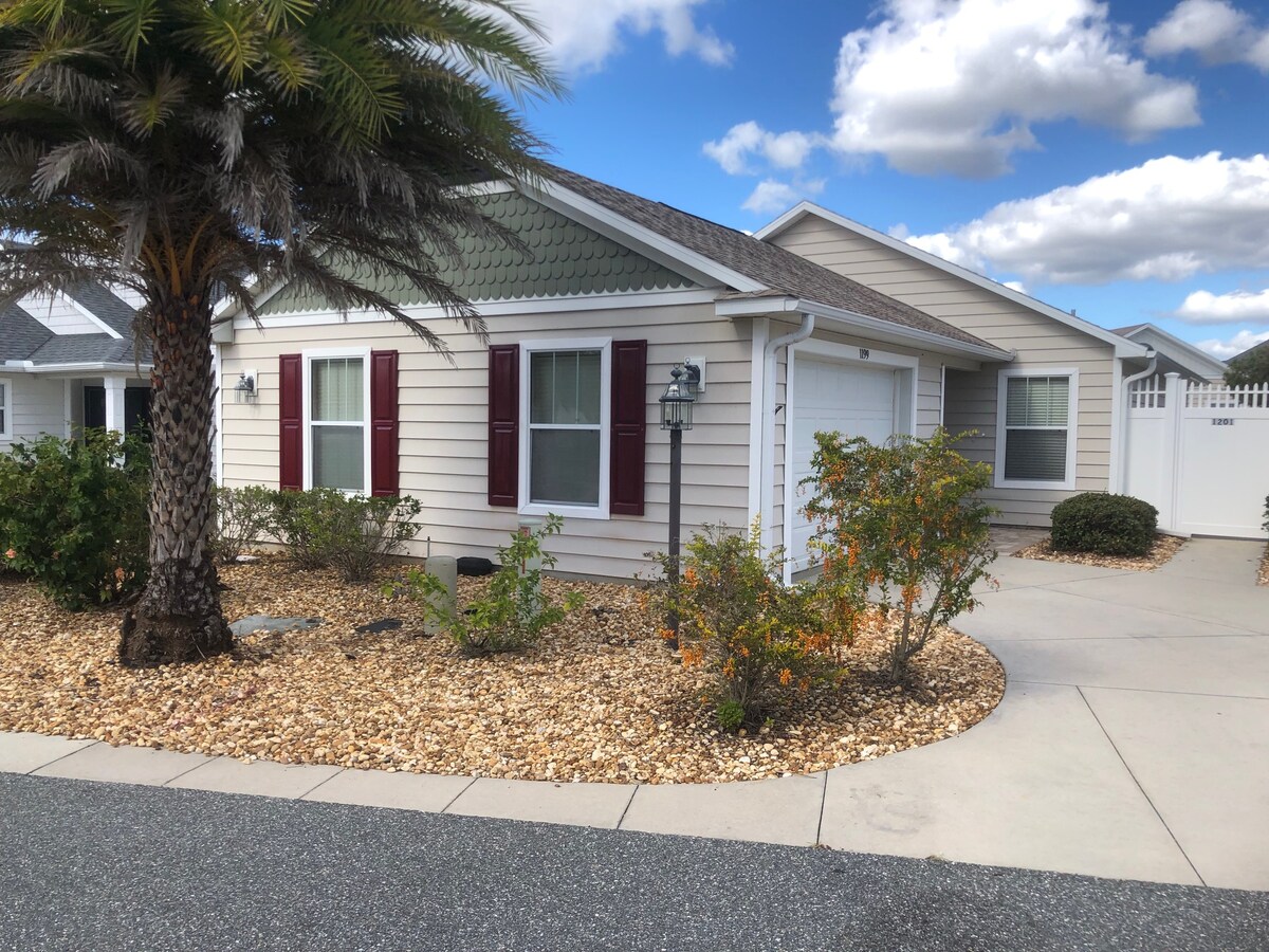 *位置! *帶購物車的露臺別墅 我們很高興歡迎您來到我們位於薩姆特湖蘭丁( Lake Sumter Landing ) ( 1.6英裏)和西班牙斯普林斯( Spanish Springs ) ( 2英裏)之間的舒適地點,距離購物中心僅10分鐘車程。 * *客廳新增了躺椅。 這棟2間臥室、2間浴室的露臺別墅擁有如家一般的舒適。 一張加大雙人牀和一張加大雙人牀。 三臺配備Roku的智慧電視。 我們歡迎年輕房客和小型寵物。 四座電動高爾夫球車供您探索。
