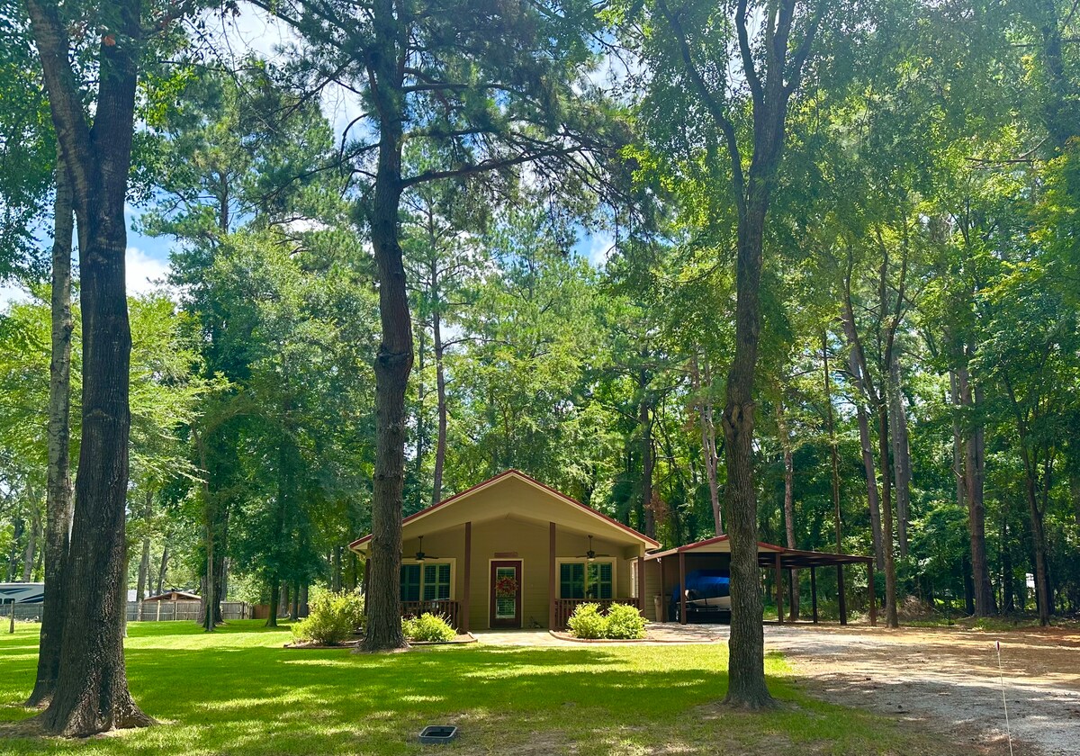 在橡樹下享受寧靜的住宿體驗 這裡有舒適的床鋪、開放式的空間和令人振奮的廚房,讓您有家的感覺。 在外面,沉浸在德州東部的美景中。前門廊可俯瞰鹿經常經過的田野。後院提供充足的用餐、放鬆和觀鳥空間。 旁邊有一片風景如畫的春季野花田,還有蜂巢。此房源不會噴霧,在叢林國家,預計會有小動物。
