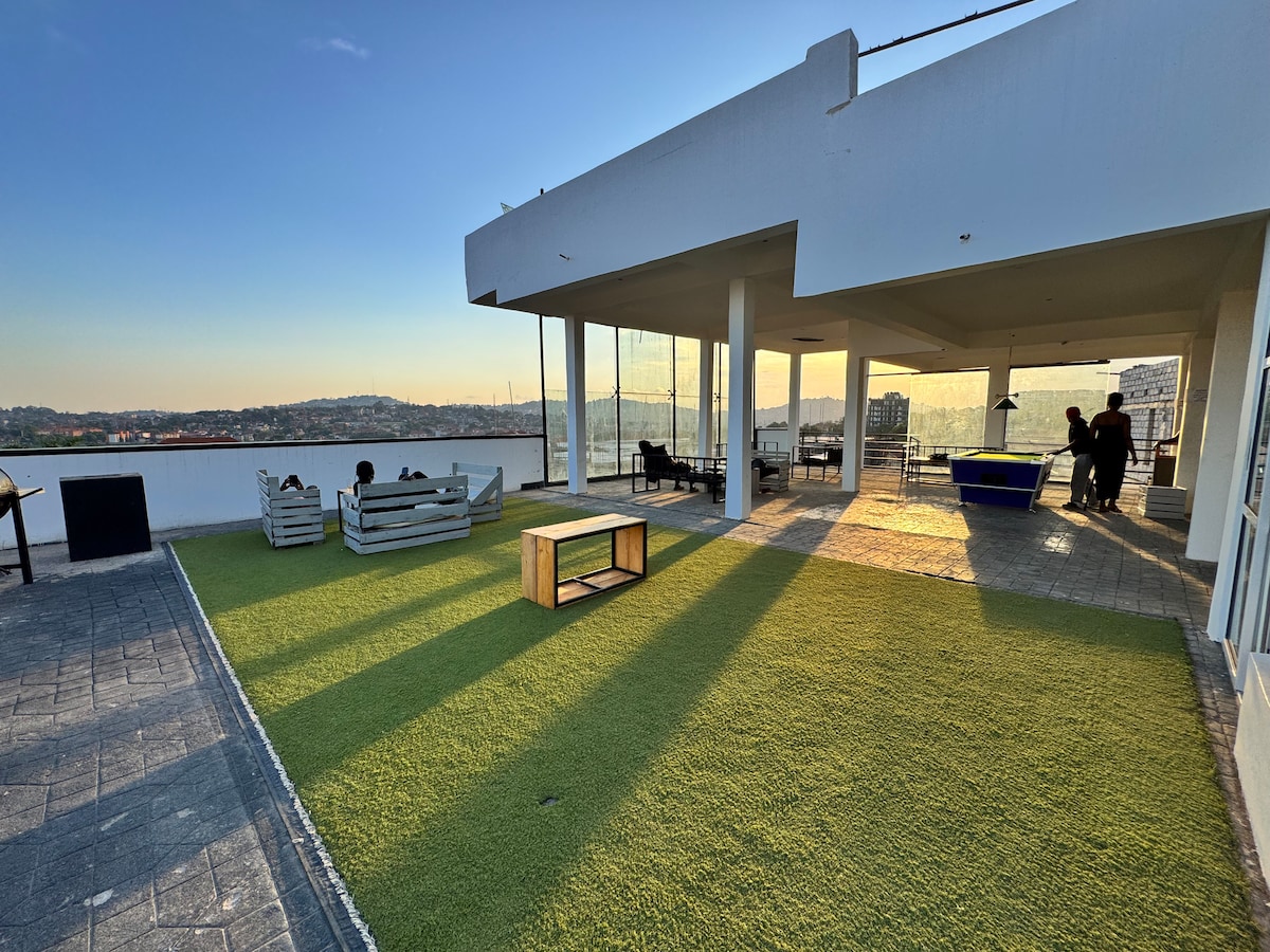 現代化的開放式4居室房源,配有巨大的露台,可欣賞坎帕拉(Kampala)山丘、維多利亞湖(Lake Victoria)或星空。 非常適合家庭或團體入住,有充足的生活空間和兒童遊樂區,也有適合情侶的可愛氛圍。 最近新增了家庭泳池和休息室甲板,為您提供一片小綠洲,讓您放鬆身心。